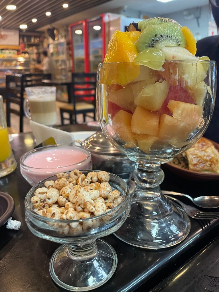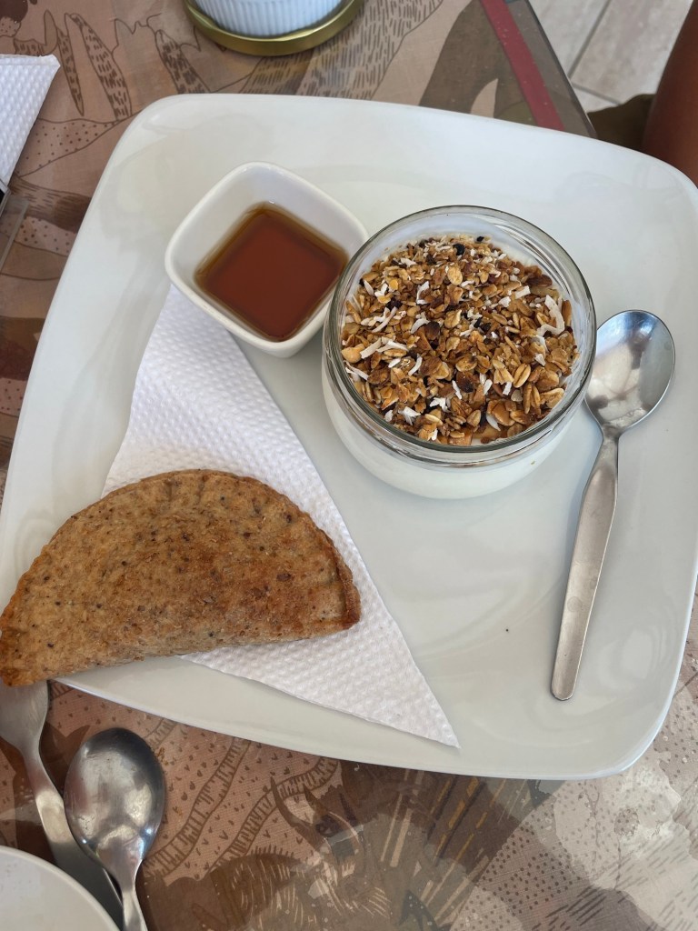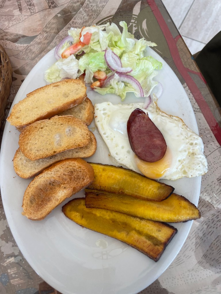 Nous commençons la journée dans un petit café un peu bobo que nous avions repéré hier soir. Au menu : œuf au plat, saucisse, empañada au fromage tout sec à la farine de bobo, yaourt et granola, et un très bon roulé à la cannelle.