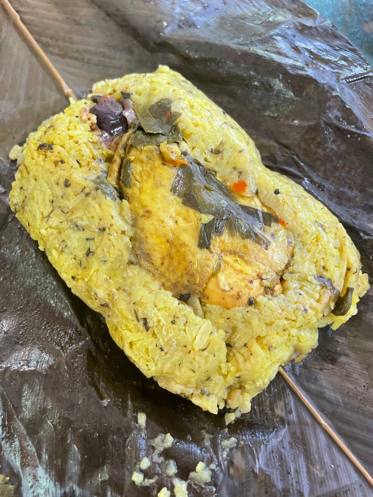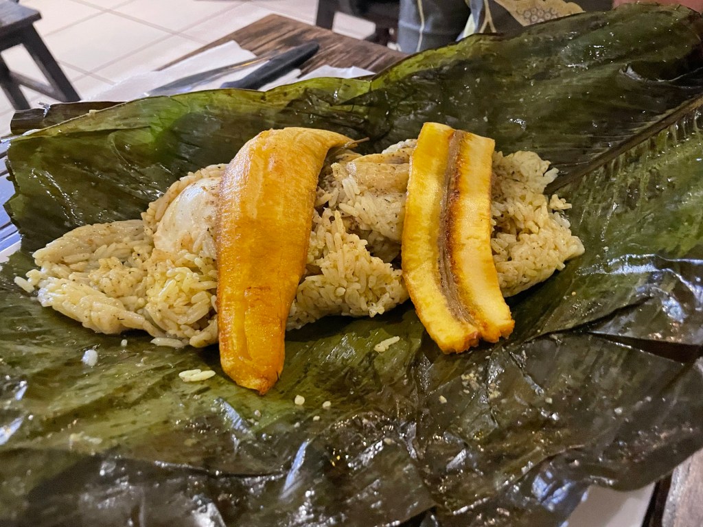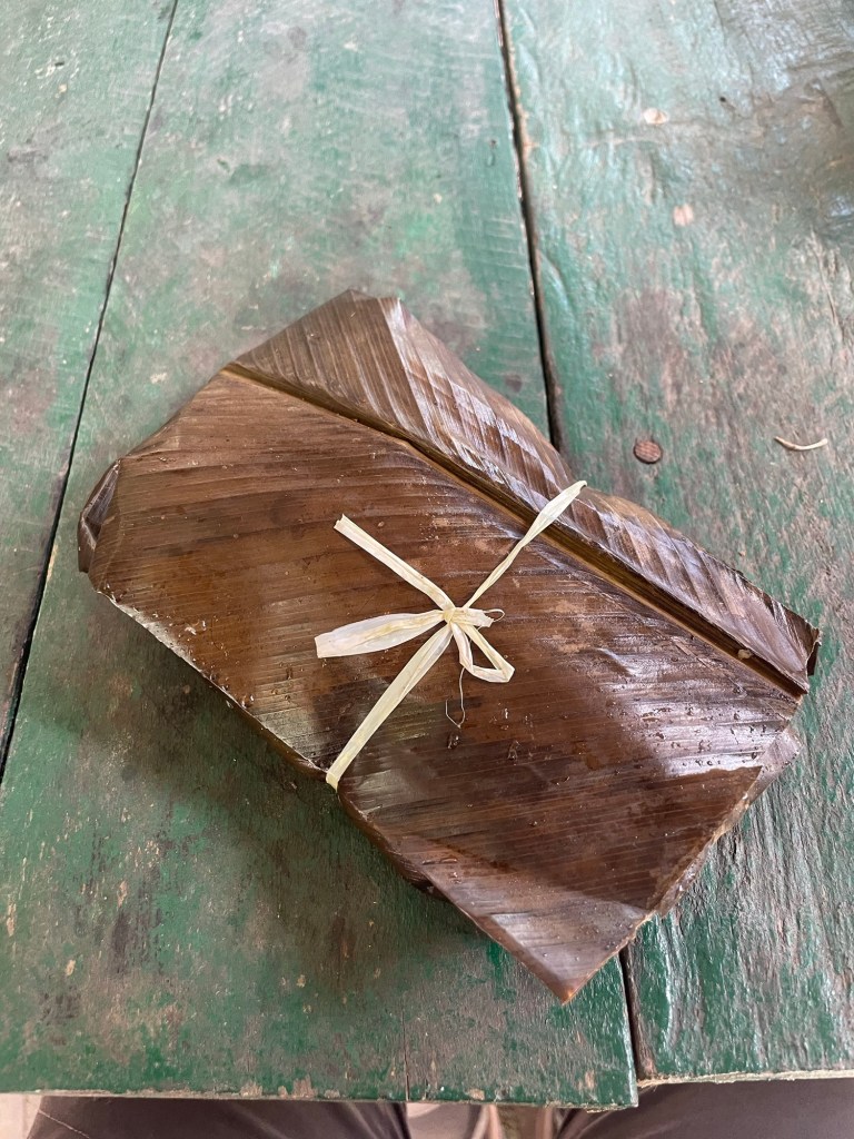 Nous nous arrêtons déjeuner notre juane, un plat typique de la jungle à base de riz, poulet et sauce piment cuits dans une feuille de bananier, pratique à transporter pour le pique-nique !