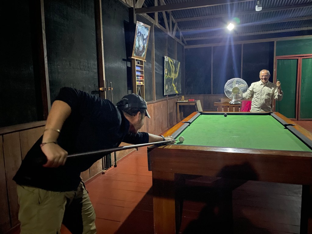 À midi, nous dégustons nos petits poissons frits en entrée, puis nous passons l’après-midi à jouer au billard et profiter du jardin avant de rentrer sur Puerto Maldonado dans la soirée.
