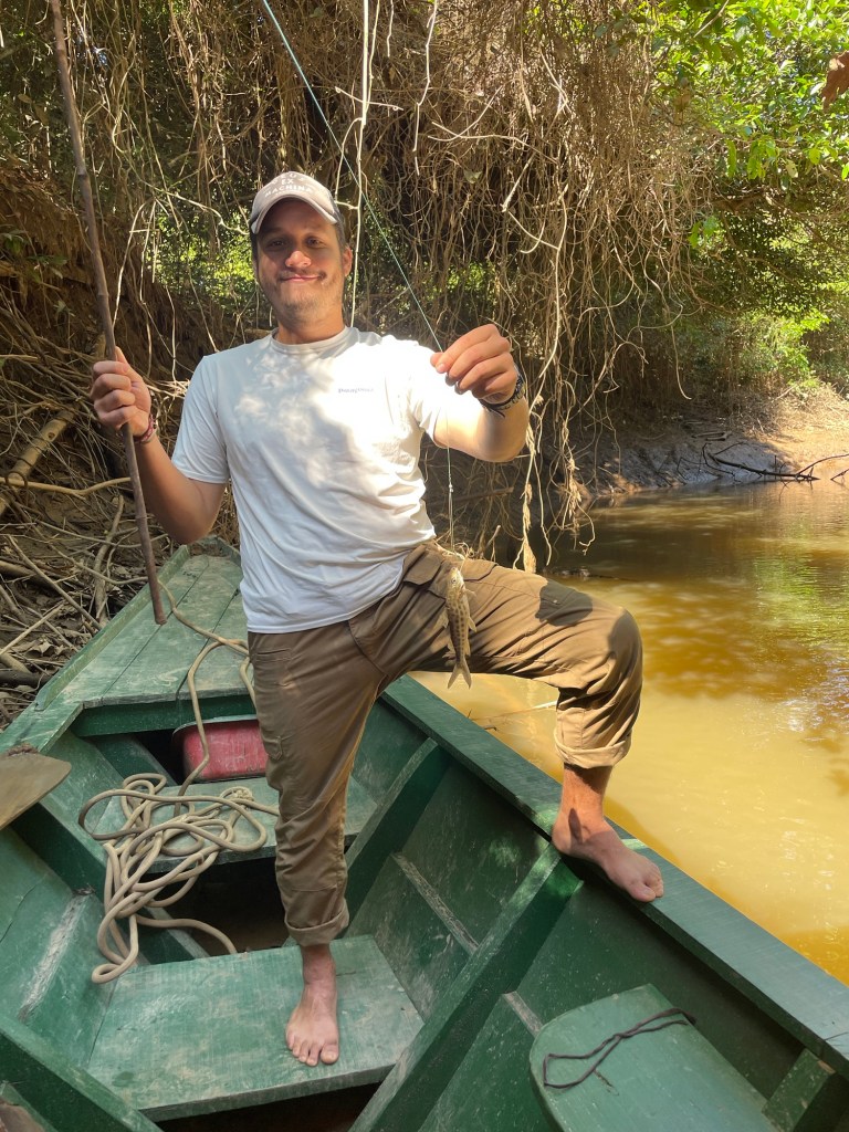 Pour notre dernière matinée, nous allons pêcher le piranha dans le rio. Le conducteur parvient à nous faire rentrer dans un tout petit ruisseau à peine plus large que le bateau, où nous installons pour pêcher. Les cannes sont rudimentaires : une fine branche de bois, du fil de pêche et un hameçon avec un morceau de poulet. Guillaume attrape un premier poisson-chat, suivi d’un autre petit pour moi. Ensuite c’est notre guide qui parvient à compléter notre pêche, avec une technique typique : il frappe l’eau avec son appât, très rapidement, et arrive à pêcher des piranhas en leur plantant l’hameçon dans le ventre !