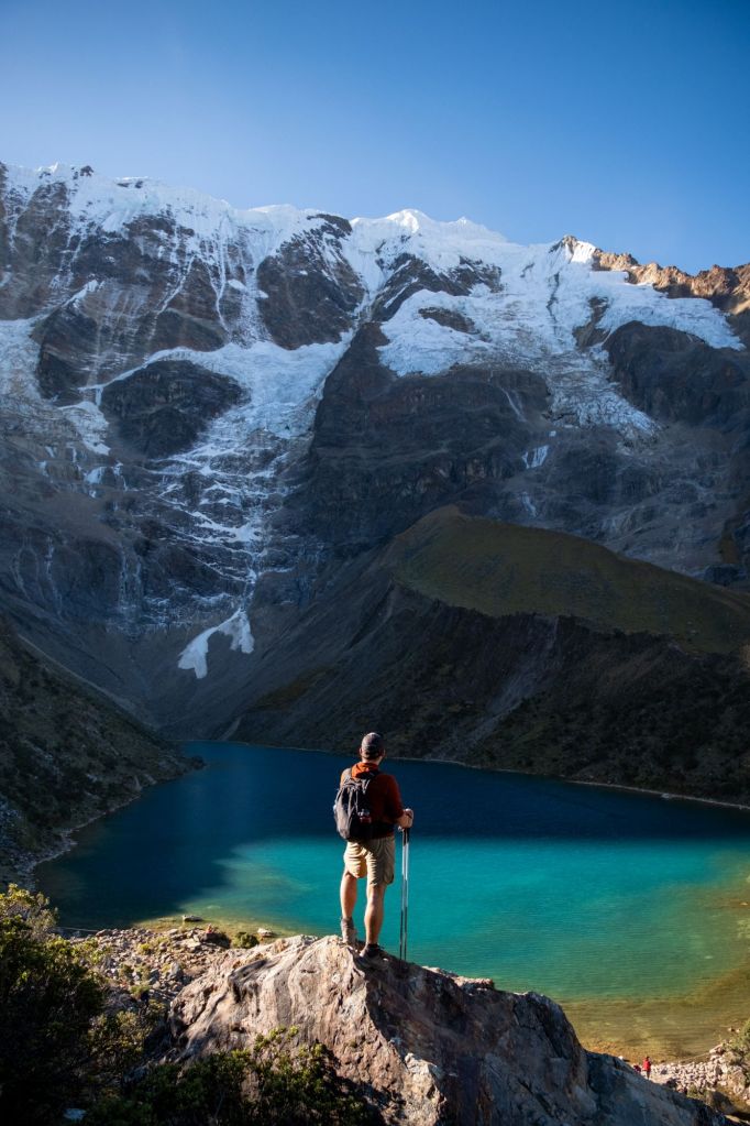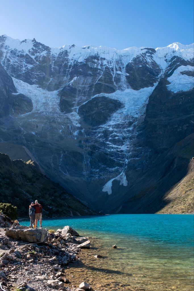 Nous entamons ensuite notre premier jour de randonnée, en laissant nos sacs à l’auberge. Nous faisons l’aller-retour jusqu’à la Laguna Humantay, au-dessus du village de Soraypampa. Nous grimpons une belle côte et arrivons en moins d’une heure à la lagune, nichée à 4200m d’altitude. C’est un joli lac à la belle couleur bleue, entouré de hautes montagnes à pic.