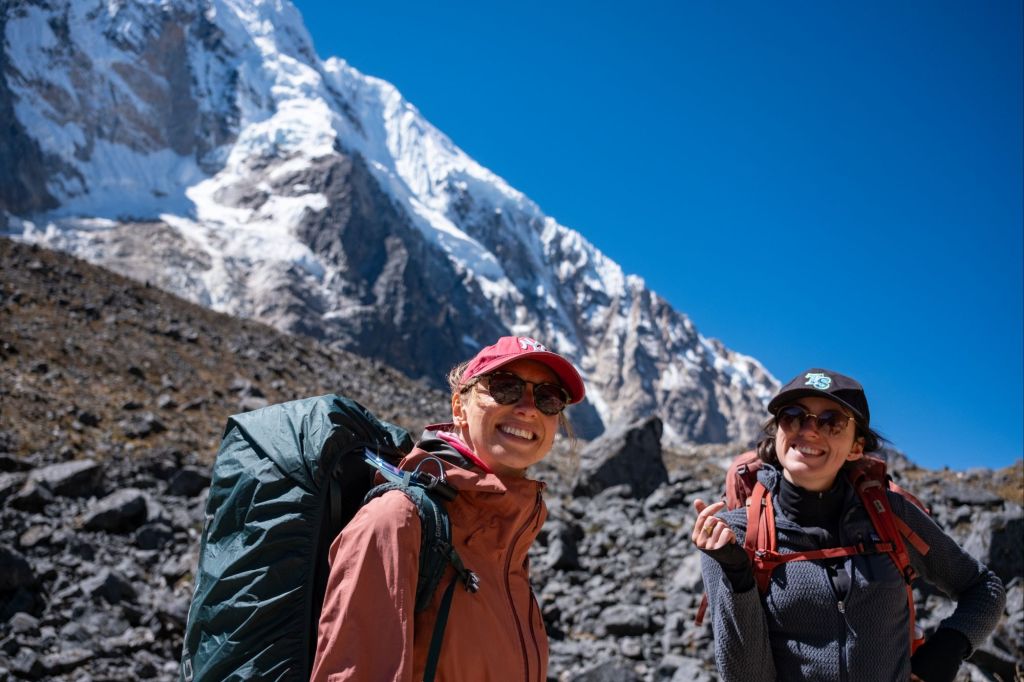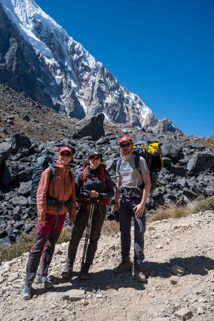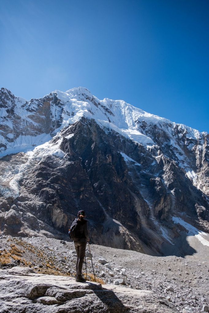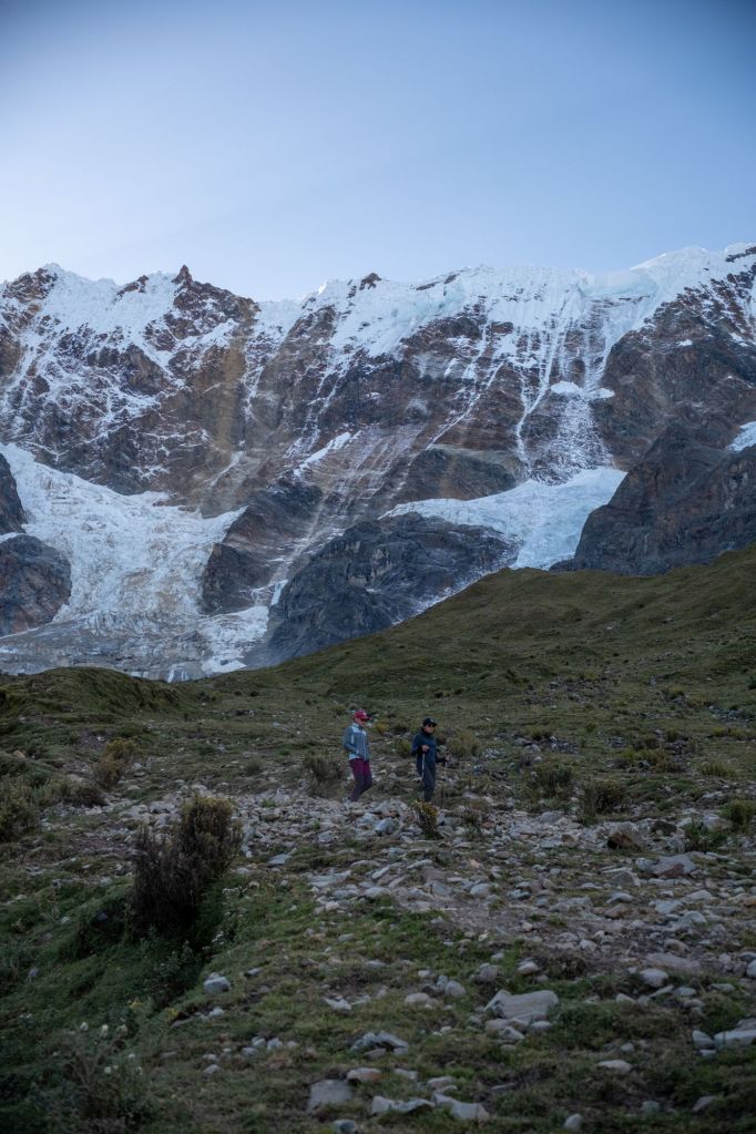 Nous commençons la journée par de la montée : 800m de dénivelé positif, pour arriver à une altitude de 4600m. La montée est très difficile pour moi, je suis faible et mes jambes me portent difficilement. Les hommes me prennent tout le contenu de mon sac à dos (ET mon sac a dos) pour m’alléger, mais même comme ça c’est difficile. Les paysages sont beaux, nous sommes entourés de hautes montagnes et de glaciers.