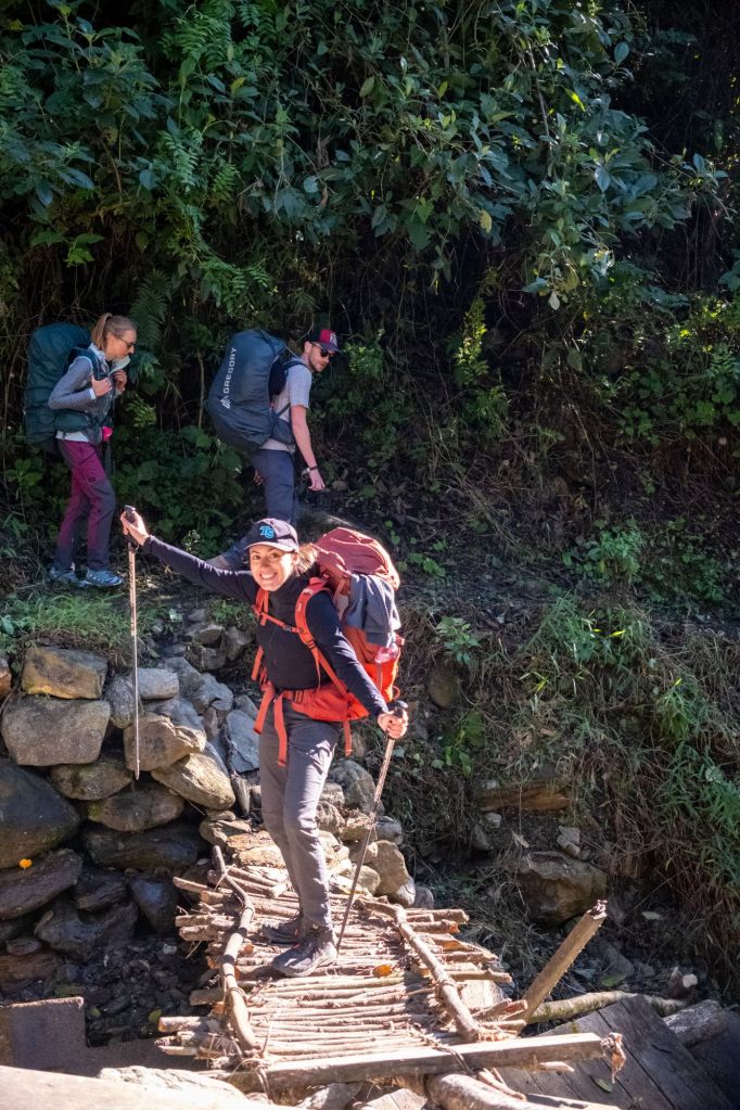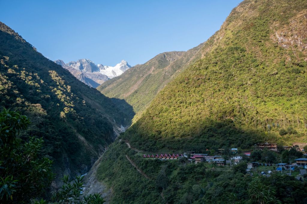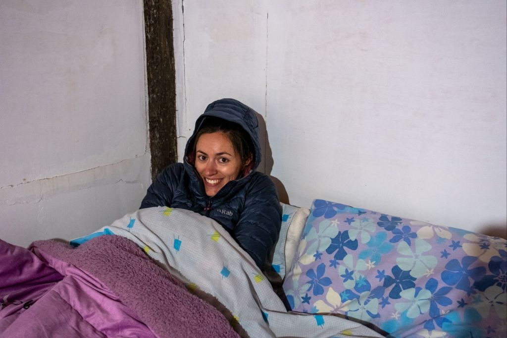 De retour à notre refuge, nous prenons une rapide douche glacée entre 3 murs de bois sans porte, avec vue sur la vallée. Puis nous nous attablons pour le repas du soir. Nous avons toutes nos couches de vêtements et il fait déjà bien froid, y compris à l’intérieur, car rien n’est isolé ni chauffé. Nous allons nous coucher sans demander notre reste, contents de se glisser sous les piles de couvertures. Malheureusement mon ventre commence à gargouiller de façon suspecte, et je passe une partie de la nuit aux toilettes, au fond du jardin, dans le froid glacial. J’accuse la soupe aux tripes du midi. Je sens que le trek va bien commencer…