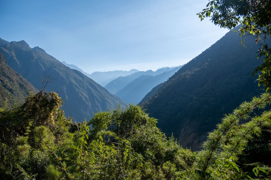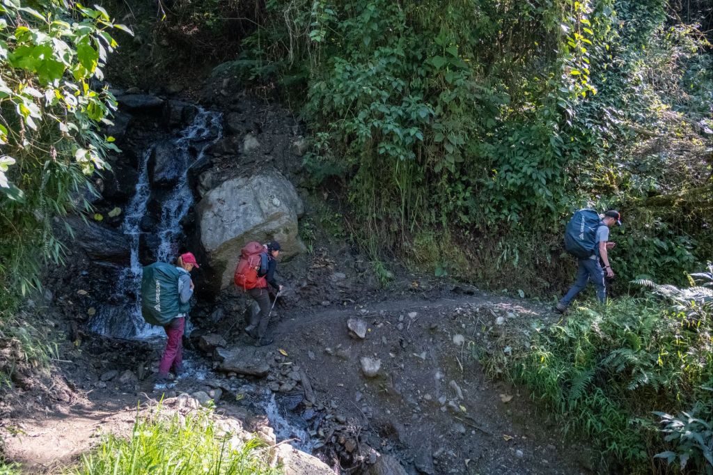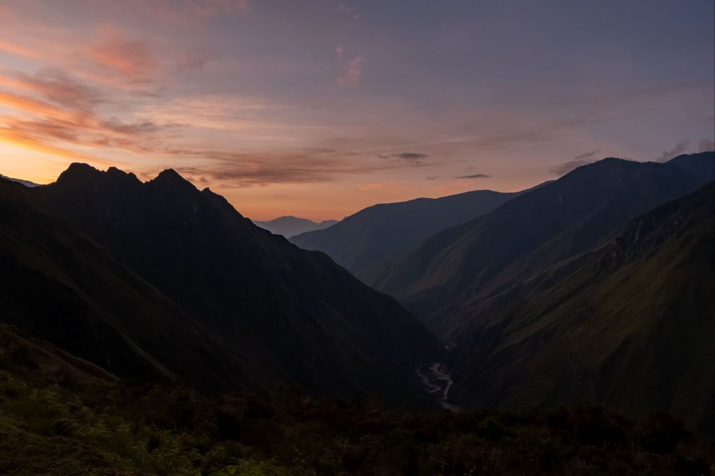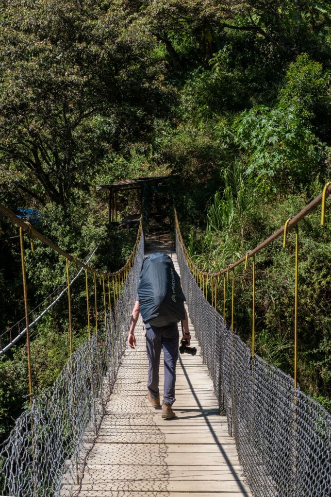 Nous commençons notre journée à l’aube car ce sont 25km qui nous attendent aujourd’hui. Nous commençons par de la descente sur 18km, dans une végétation tropicale. Nous longeons la vallée où coule le Rio Santa Teresa. La terre est très friable et le sentier s’est éboulé par endroits, mais des petits chemins alternatifs ont été créés pour nous permettre de passer.