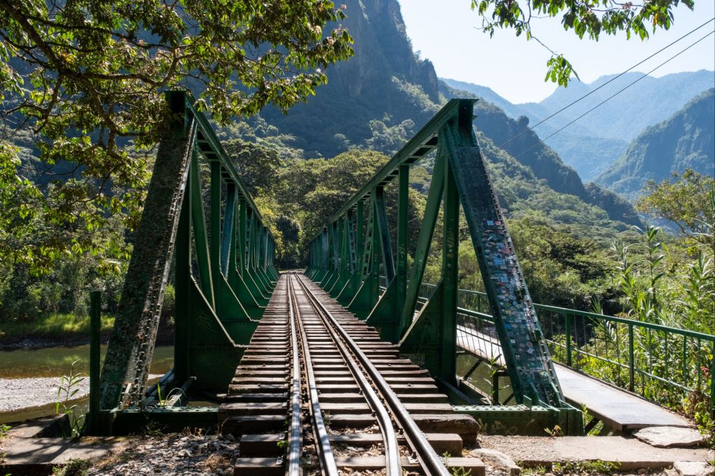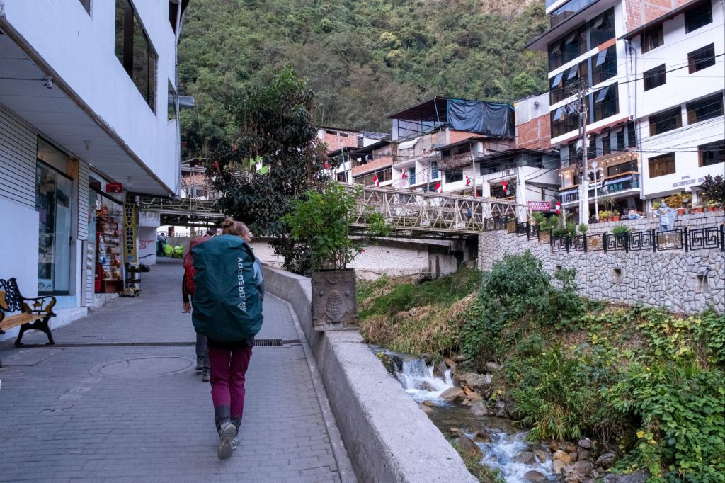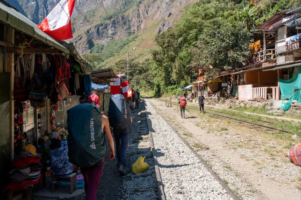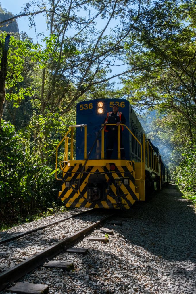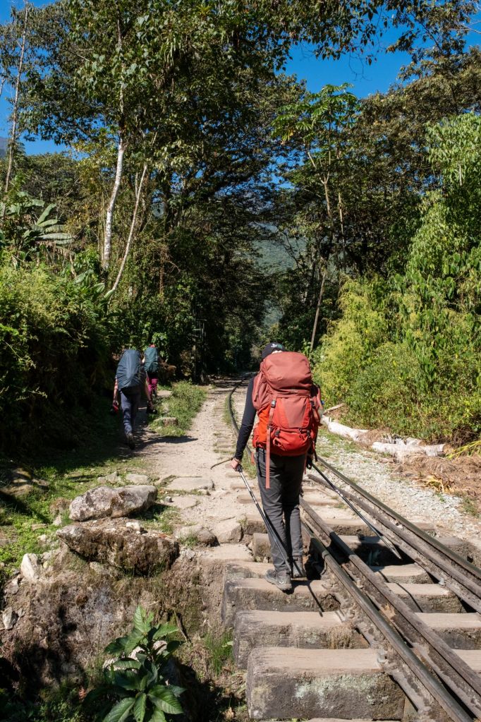 Nous arrivons au pied de la montagne, à Hidroelectrica, où notre chemin se poursuite le long des rails du train jusqu’à Aguas Calientes. Le sentier n’est pas très intéressant mais ombragé, ce qui est appréciable. Nous croisons plusieurs trains à destination du Machu Picchu qui passent à côté de nous en klaxonnant bruyamment.