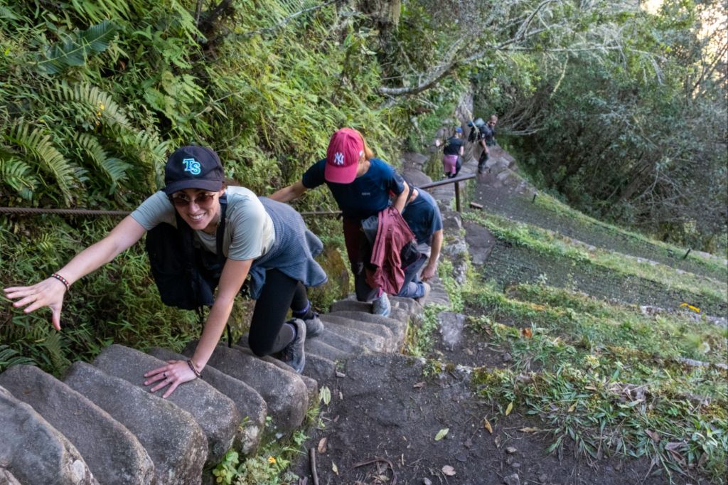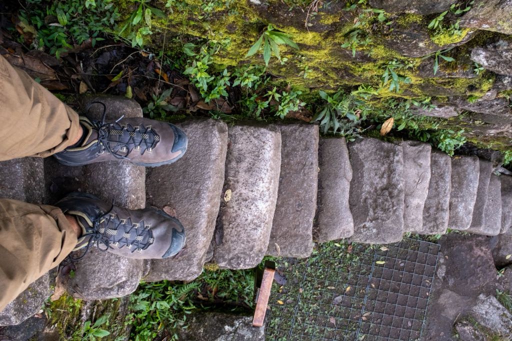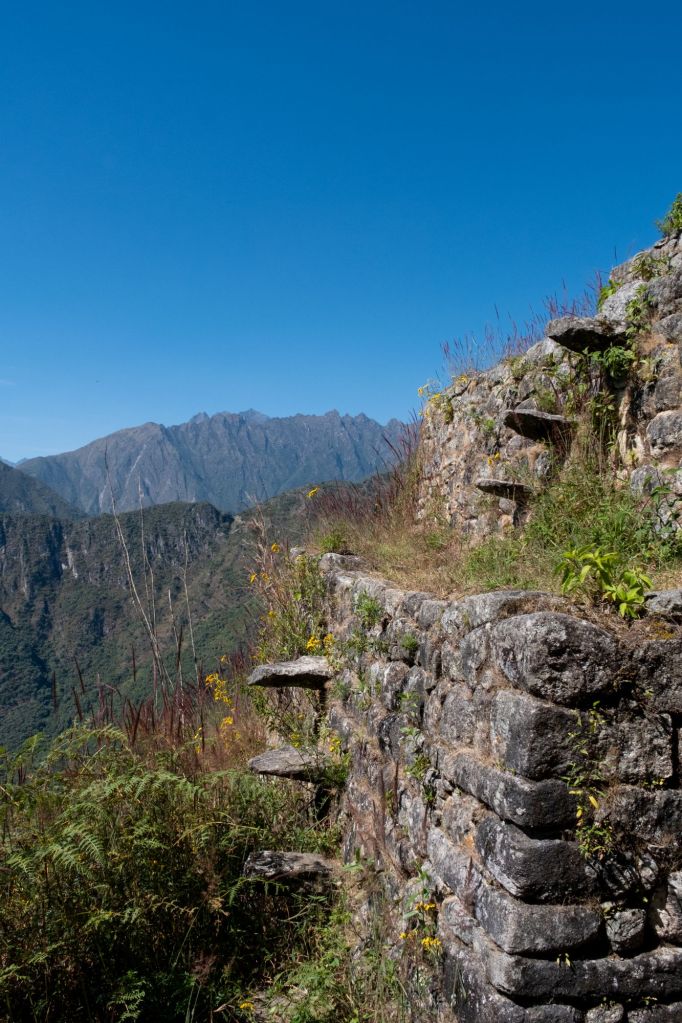Nous nous rendons ensuite à la montagne Huayna Picchu, que nous avons choisi de gravir pour avoir une jolie vue au-dessus du site. C’est très abrupte et le sentier est essentiellement un escalier de plus en plus escarpé jusqu’au sommet de cette montagne, qui domine le site archéologique de 360m. La vue est magnifique et permet de se rendre compte de la grandeur des ruines, c’est très impressionnant.