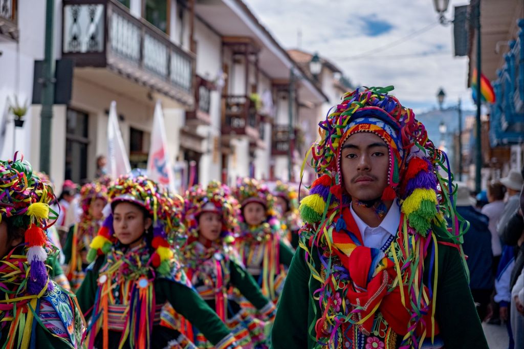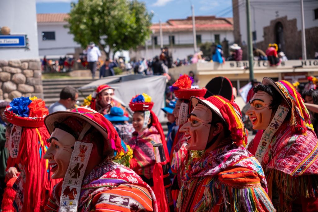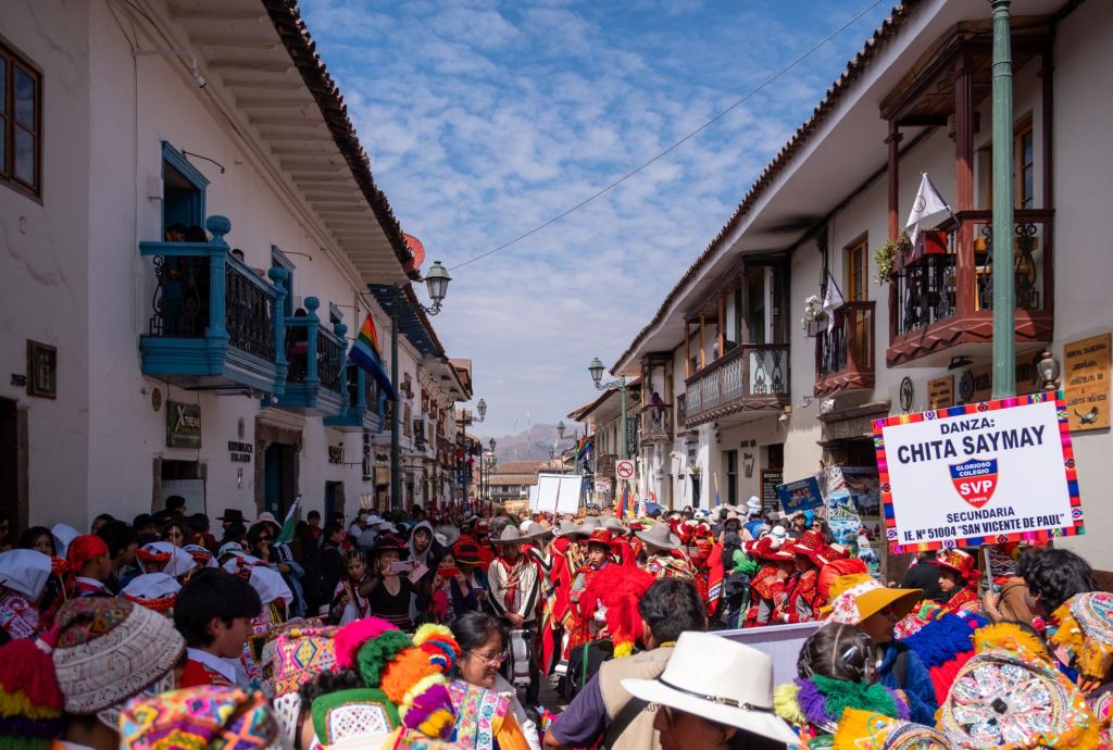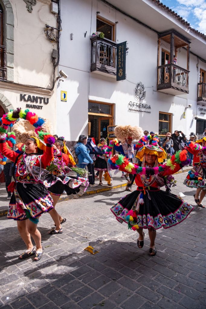 Nous profitons de la matinée pour nous reposer après cet épuisant trek, et sortons pour le déjeuner. C’est toujours la fête à Cusco pour préparer l’Inti Raymi (fête du soleil), et nous rencontrons de nombreuses processions dans la rue. Ce sont des écoles ou des clubs de sports qui défilent en costumes traditionnels et qui réalisent des chorégraphies dans la rue. L’ambiance est très sympa et nous restons un moment à les regarder danser.
