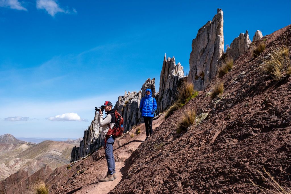Nous grimpons un pan de montagne flanqué d’impressionnantes arrêtes rocheuses à son sommet, afin d’avoir une vue panoramique. Nous nous rendons compte alors que nous sommes à 4950m, plus haut que le Mont Blanc !