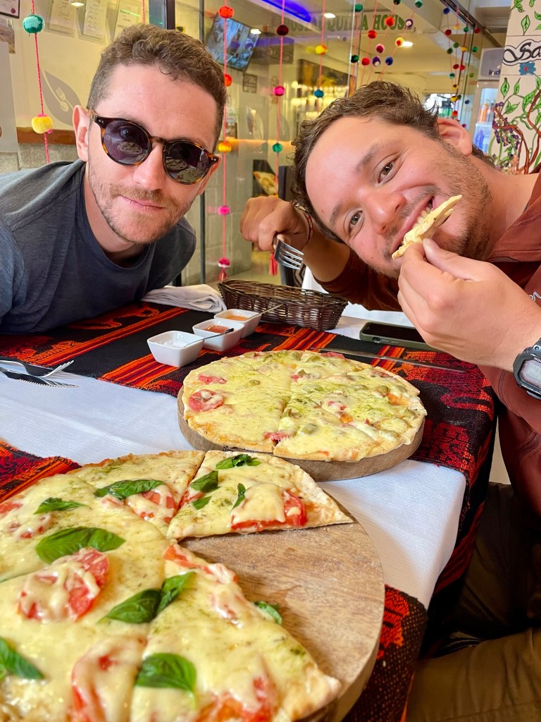 Nous arrivons en début d’après-midi à Aguas Calientes, ville-étape au pied du Machu Picchu. Nous allons tout de suite manger au restaurant Chullos, et nous nous faisons plaisir. Gnocchis au pesto et au bleu pour moi, et pizza 4 fromages pour Guillaume, miam !