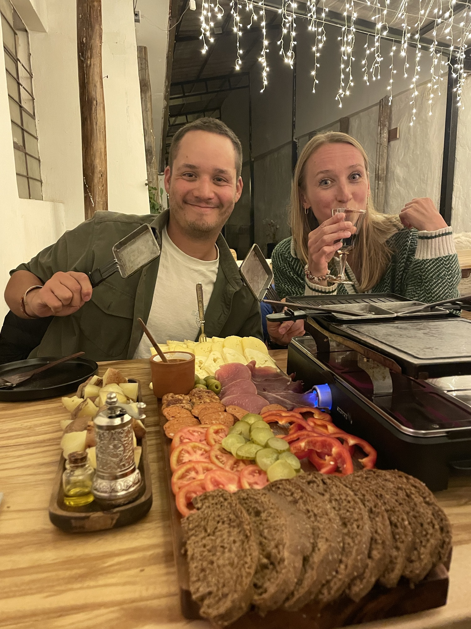 Pour ce soir, nous avons réservé chez Masha, un petit restaurant spécialisé dans la raclette ! Nous avons un assortiment de charcuterie de la région ainsi que des fromages des Andes, accompagnés de vin argentin. C’est délicieux, nous sommes aux anges !