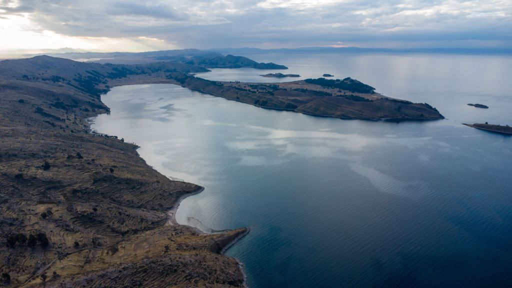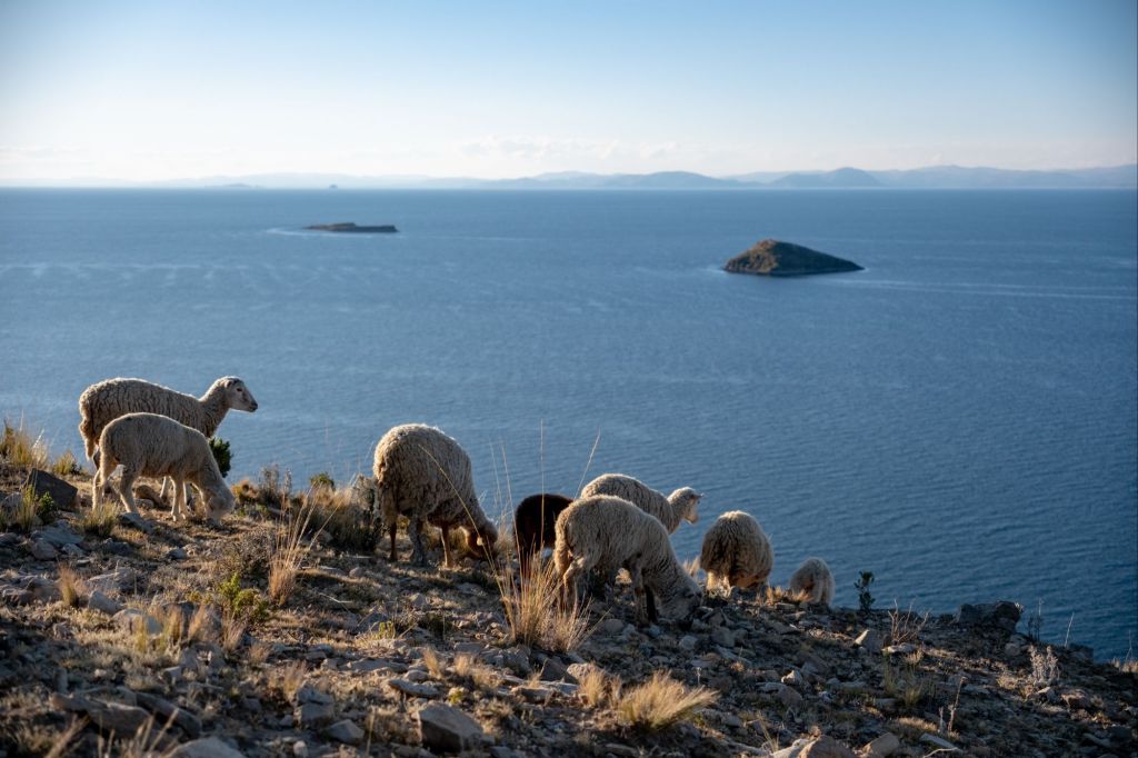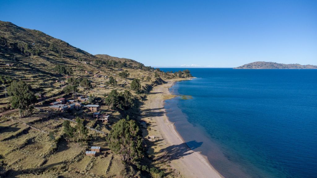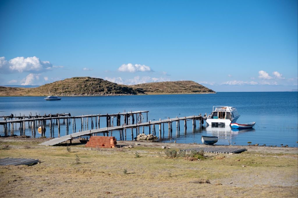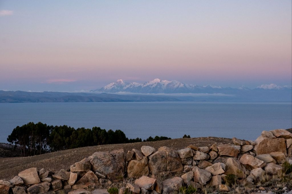 Sur le chemin du retour, nous pouvons admirer la cordillère bolivienne avec ses grandes montagnes blanches, de l’autre côté du lac.