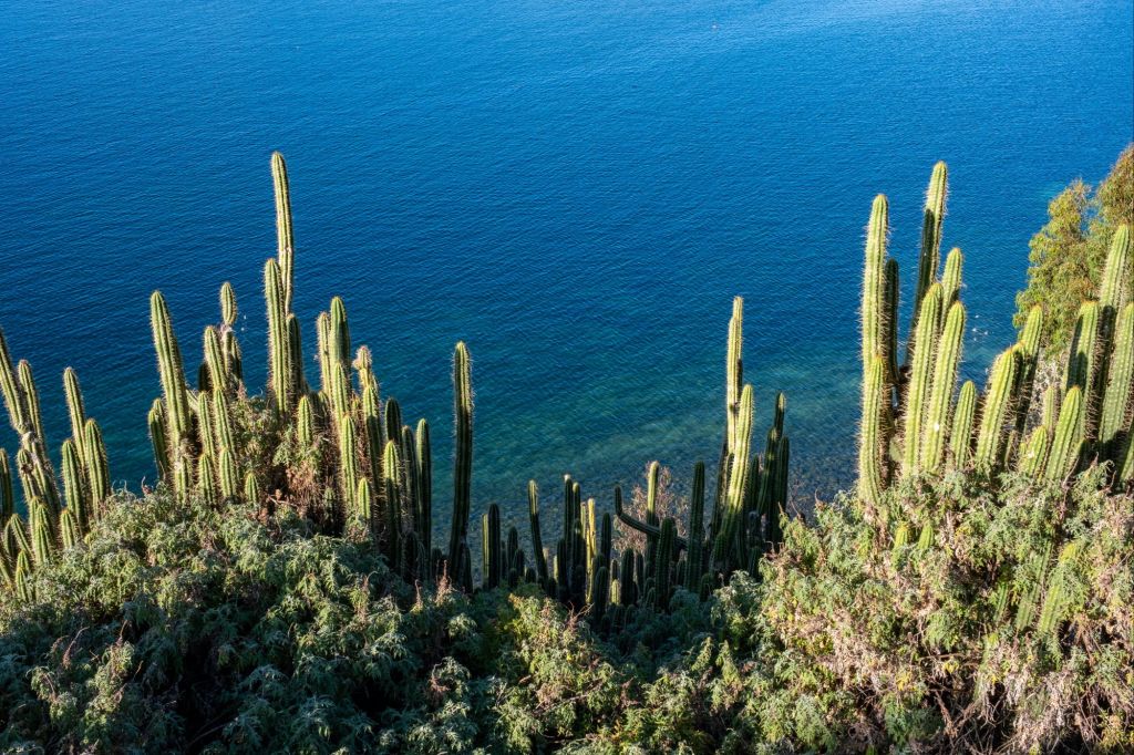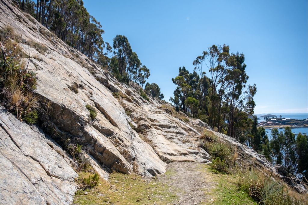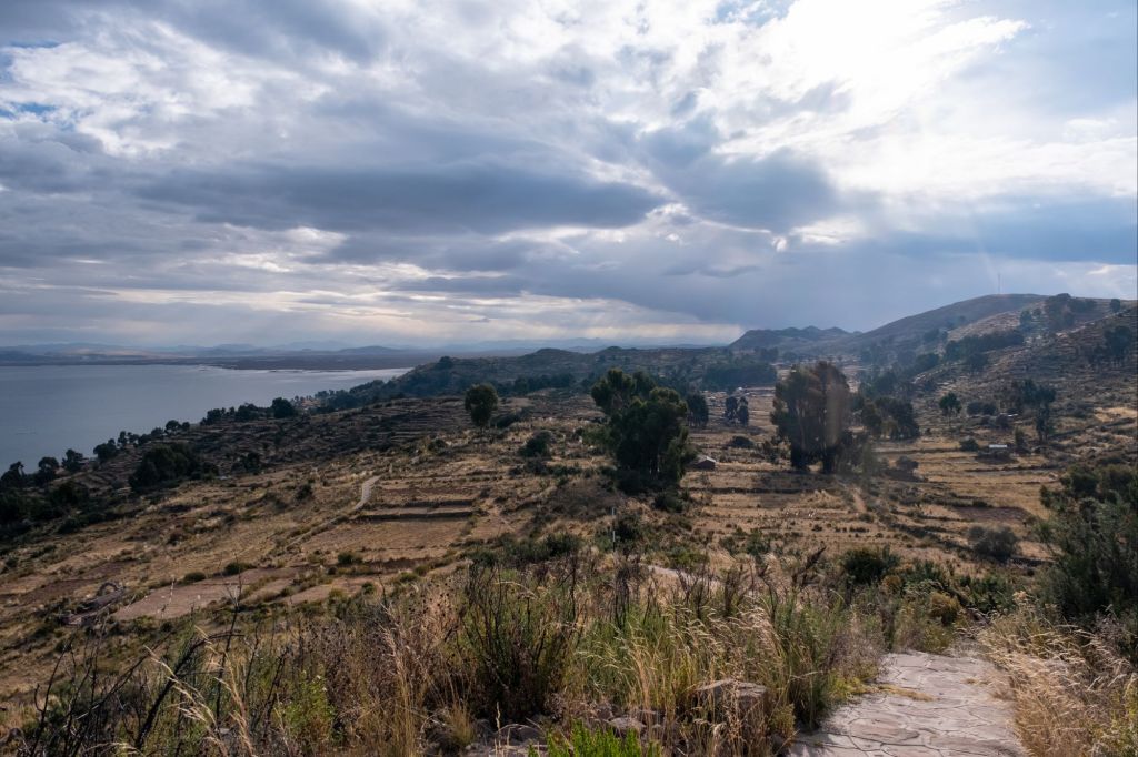 Il ne faut pas tarder car le soleil commence déjà à descendre et nous avons tout le chemin retour à faire. Nous empruntons cette fois le sentier qui passe au centre de l’île, sur les sommets des collines. La vue est magnifique, nous pouvons voir le lac des deux côtés de l’île.