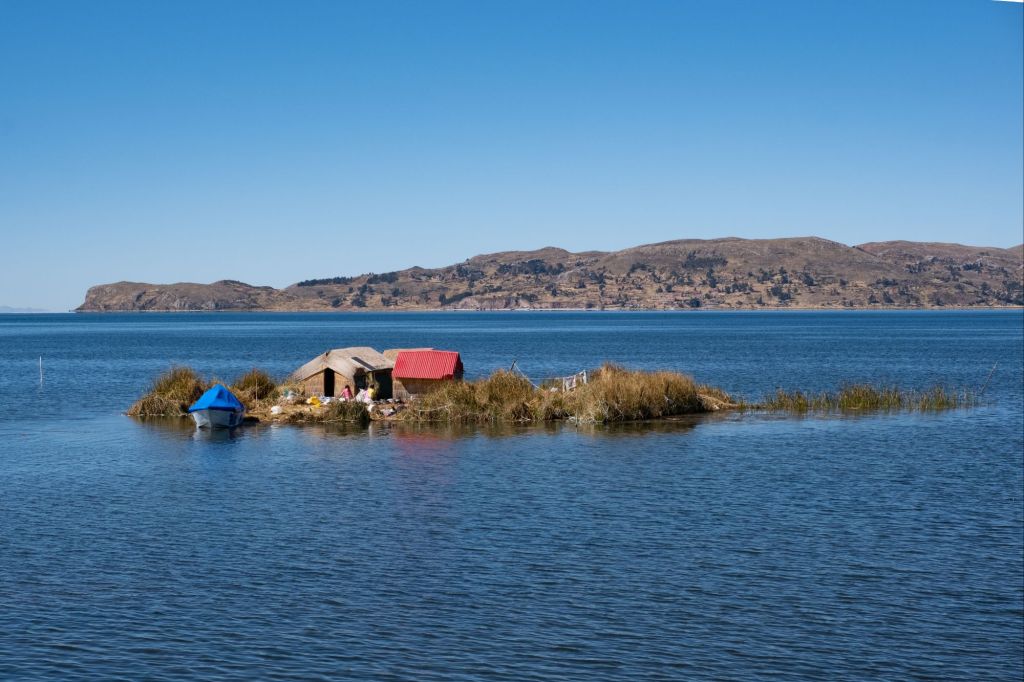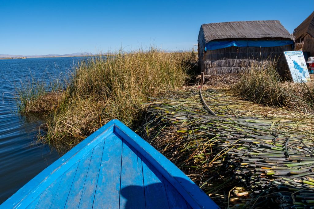 Après notre petit déjeuner avec vue sur le lac, nous partons dans une petite barque pour une matinée sur le lac. Nous allons à la découverte des îles flottantes du peuple Uros, sur lesquelles quelques milliers de personnes vivent encore actuellement. Nous longeons en barque la péninsule de Llachon, au chaud sous nos petites couvertures, en direction des îles Uros Titino. Ce sont des îles artificielles, construites par le peuple Uros, à partir de totora (une sorte de gros roseau qui pousse au bord du lac). Ils coupent de gros blocs de terre et de racines qu’ils trouvent au bord du lac, qui flottent, et les recouvrent de différentes couches de totora disposées perpendiculairement. Sur l’île que nous avons visité, 5 familles habitent (1 petite maison par famille, où ils dorment au sol sous des couvertures).