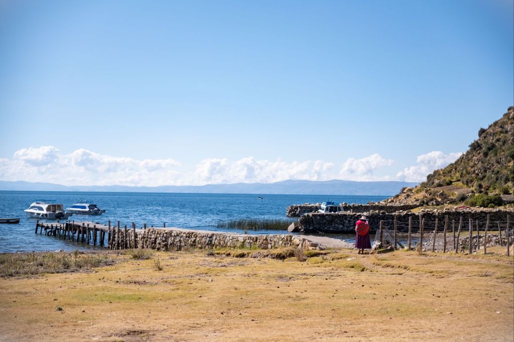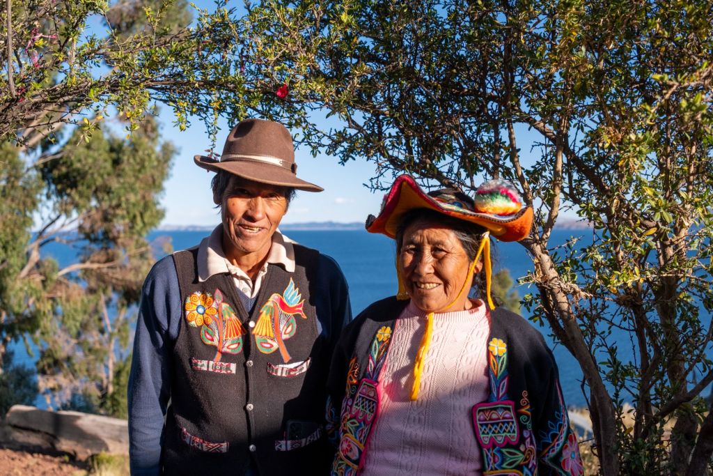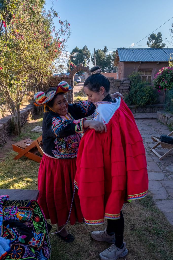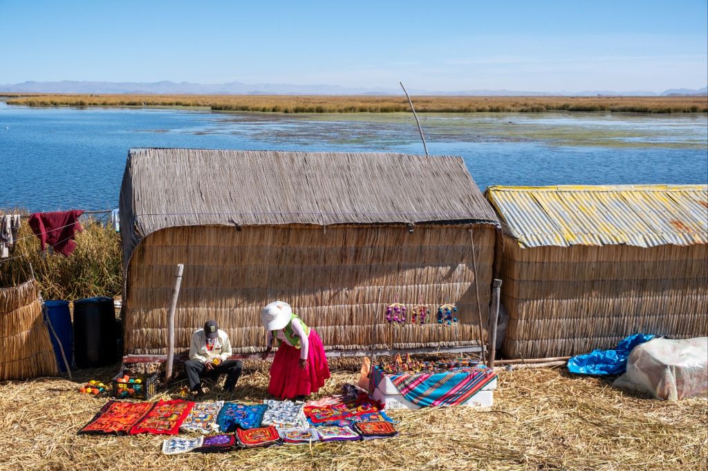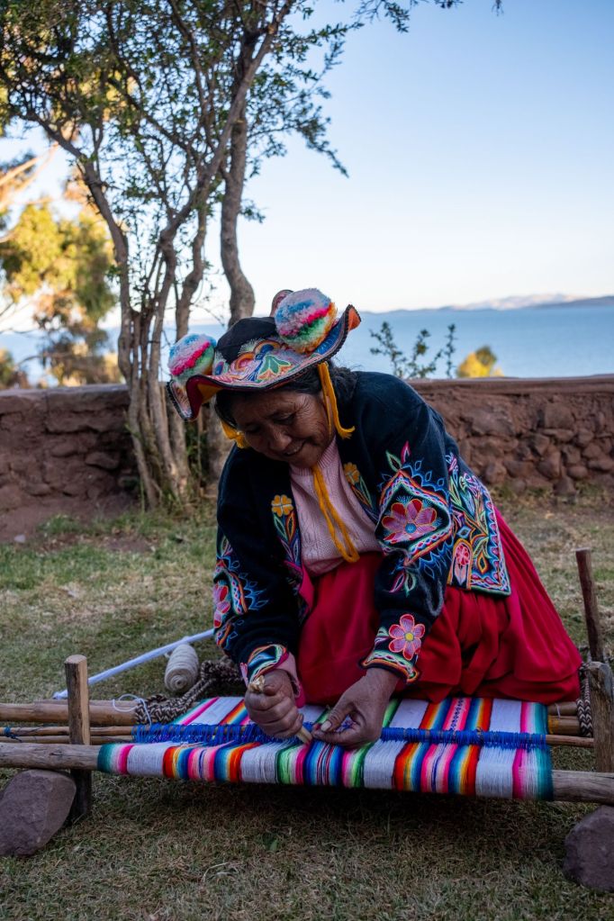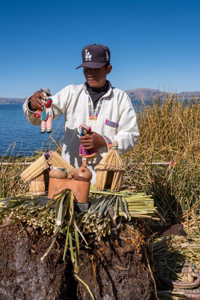 Ils fabriquaient également des bateaux avec ce roseau, qui sont maintenant remplacés par des barques en bois. Les femmes font de la broderie, et nous en profitons pour acheter une jolie taie de coussin à l’effigie de la Pachamama (la terre mère).