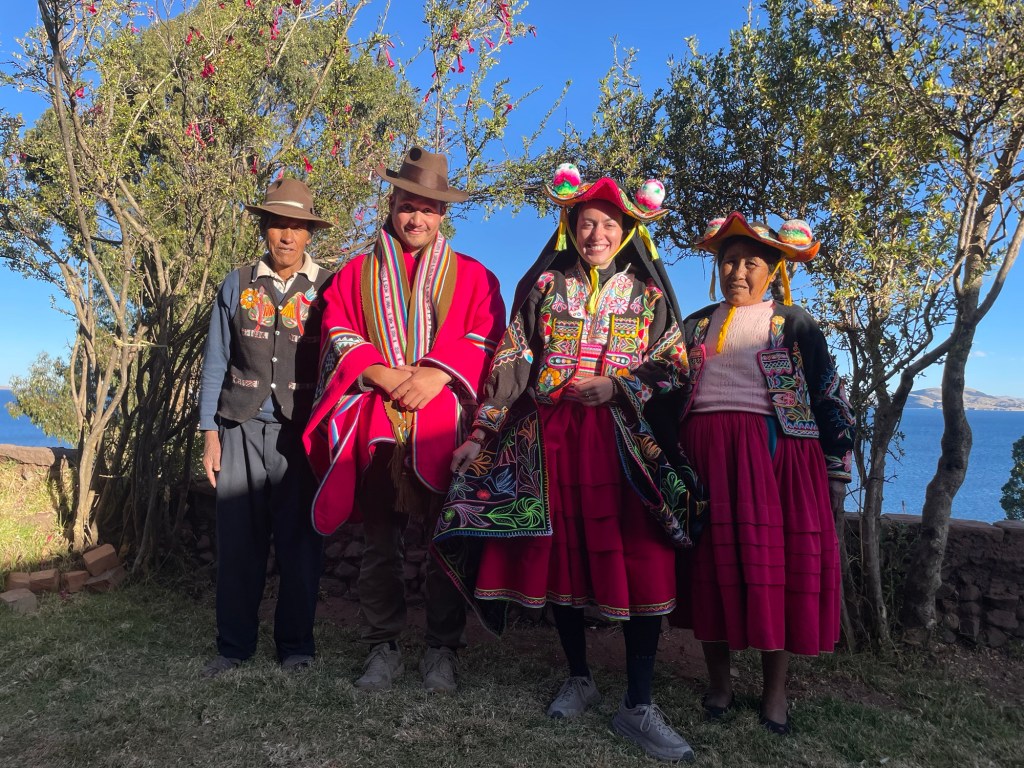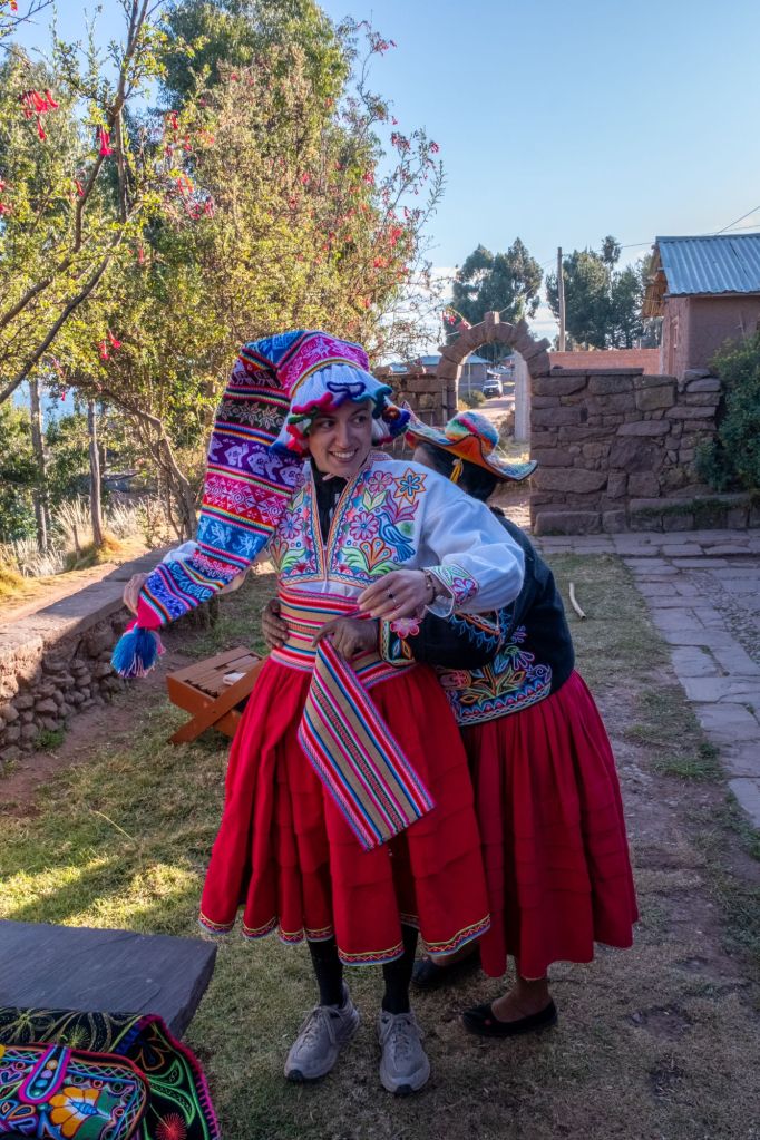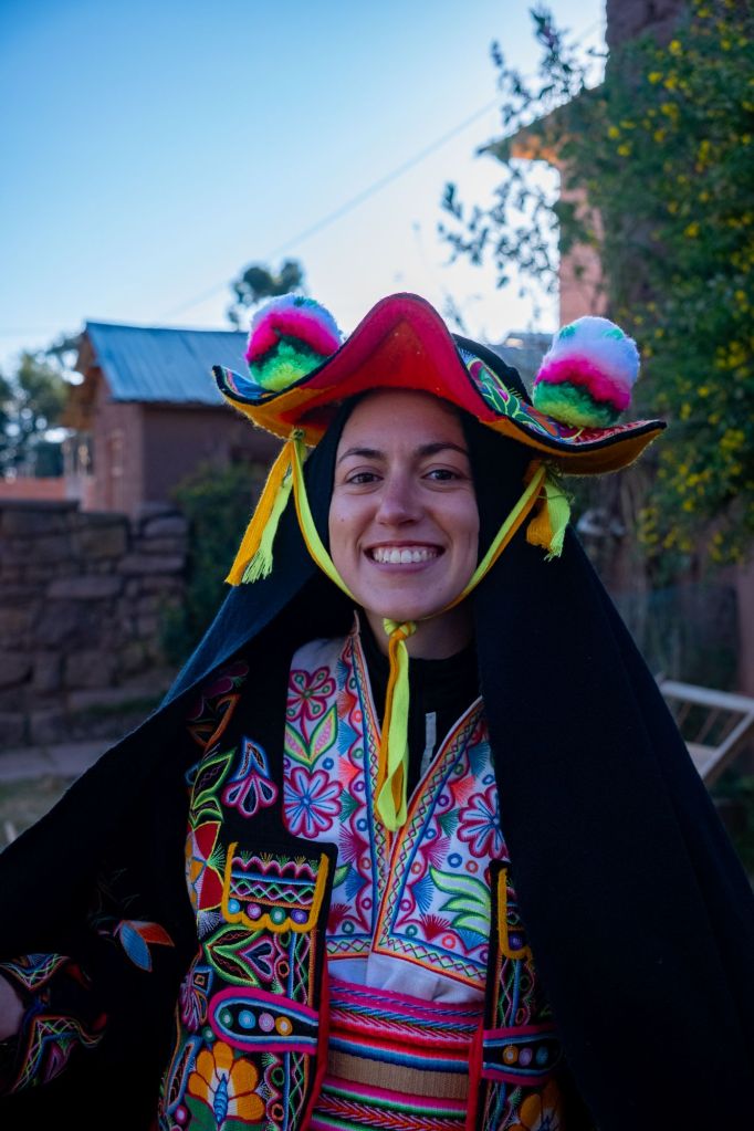 Ils nous ont également sorti leurs costumes traditionnels pour que l’on puisse les essayer et faire une petite séance photo ! Pour les hommes c’est facile : poncho, chapeau, et une écharpe dont la couleur diffère en fonction du statut marital (blanche chez les jeunes, foncée quand l’homme est marié). Pour les femmes non encore mariées : jupe, chemisier et bonnet peu seyant en forme de grande chaussette. Pour les femmes mariées : veste noire, grande cape noire qui se porte sur la tête, et le fameux chapeau de la région à cornes avec des pompons colorés dessus.
