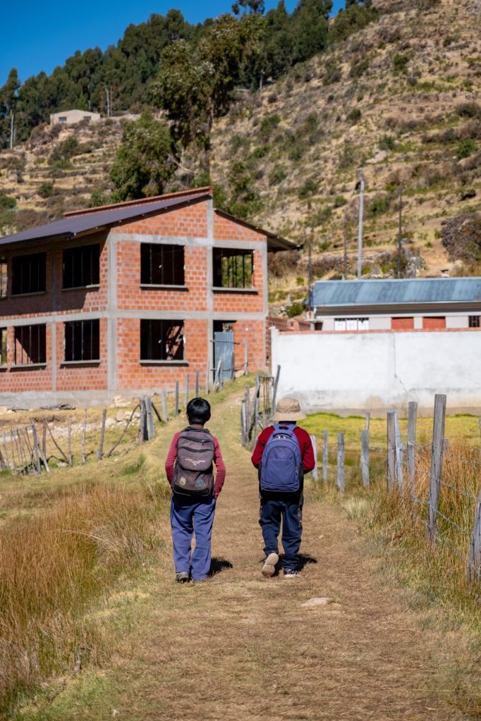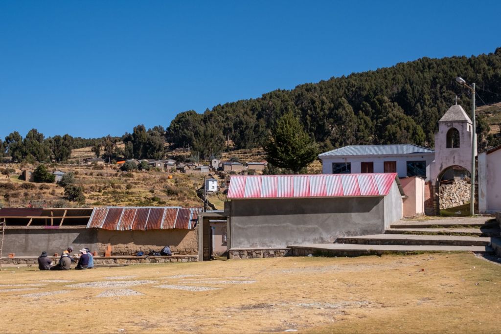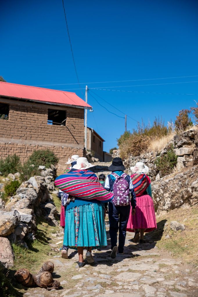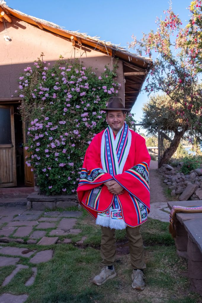 Après le petit-déjeuner à l’hôtel, nous partons prendre le collectivo pour Llachon. Nous partons enfin, après avoir attendu plus d’1h30 que le bus soit plein ! Les abords du lac sont désertiques : champs d’herbes jaunies par le soleil et petits villages de briques rouges. Nous arrivons à Llachon, petite péninsule rurale du bord du lac, en fin de matinée. Nous terminons le chemin jusqu’à la maison de Tomas Cahui, notre hôte, à pieds, car il n’y a pas vraiment de route ni de voiture (une petite piste caillouteuse tout au plus). Après 40 minutes de marche avec nos gros sacs, nous arrivons à une jolie maison fleurie avec vue sur le lac. Nous rencontrons Tomas et sa femme Serafina, leur fils Walker et sa femme et leurs 2 enfants.