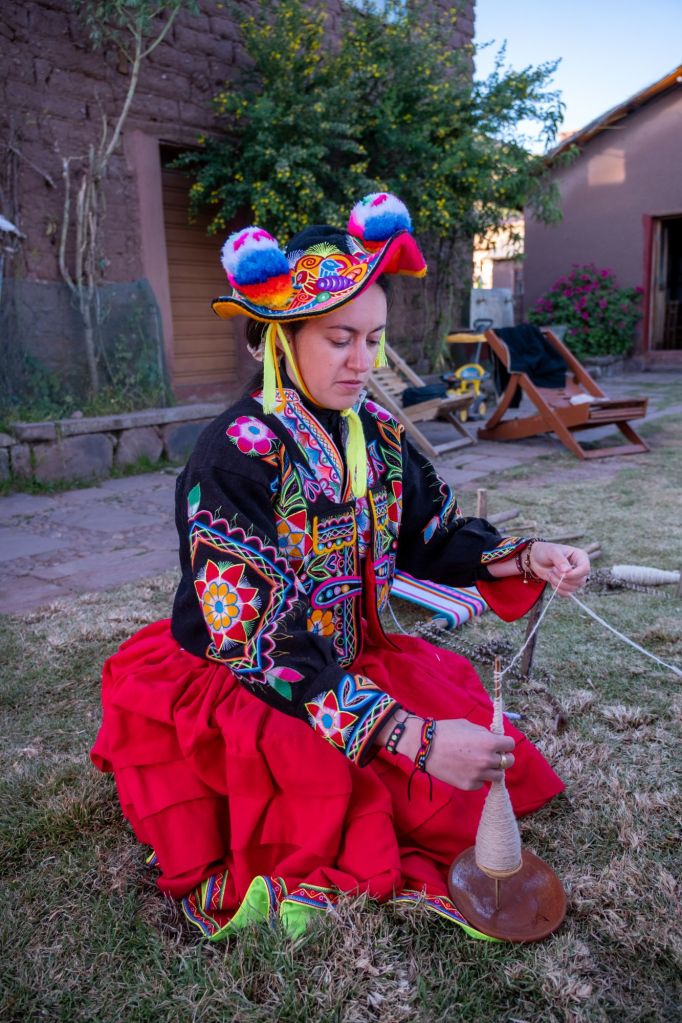 Après notre déjeuner (classique soupe andine et truite du lac), Tomas et Serafina nous montrent comment tisser la laine de mouton. La laine pure est filée à l’aide d’un fuseau qu’il faut faire tourner pour former du fil. Puis le fil est doublé pour le rendre plus solide. Enfin, Serafina nous montre son métier à tisser artisanal : 4 morceaux de bois forment le cadre entre lesquels sont tendus les fils de différentes couleurs, un autre morceau de bois avec les fils séparateurs, et la navette. Il faut brosser les fils avec un os d’alpaga à chaque passage de la navette et bien tasser le tissage. C’est technique et très long !