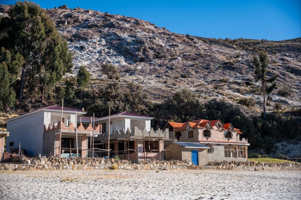 Nous remontons dans le bus et continuons à longer le lac. Les villages se ressemblent : petites maisons de briques au milieu d’herbes jaunes, et des marais de joncs en bataille sur les rives du lac. Sa taille est impressionnante, par endroits on ne voit pas la rive d’en face ! Nous nous dirigeons vers la chaîne de montagnes toutes blanches que l’on apercevait depuis l’île, en direction de La Paz.