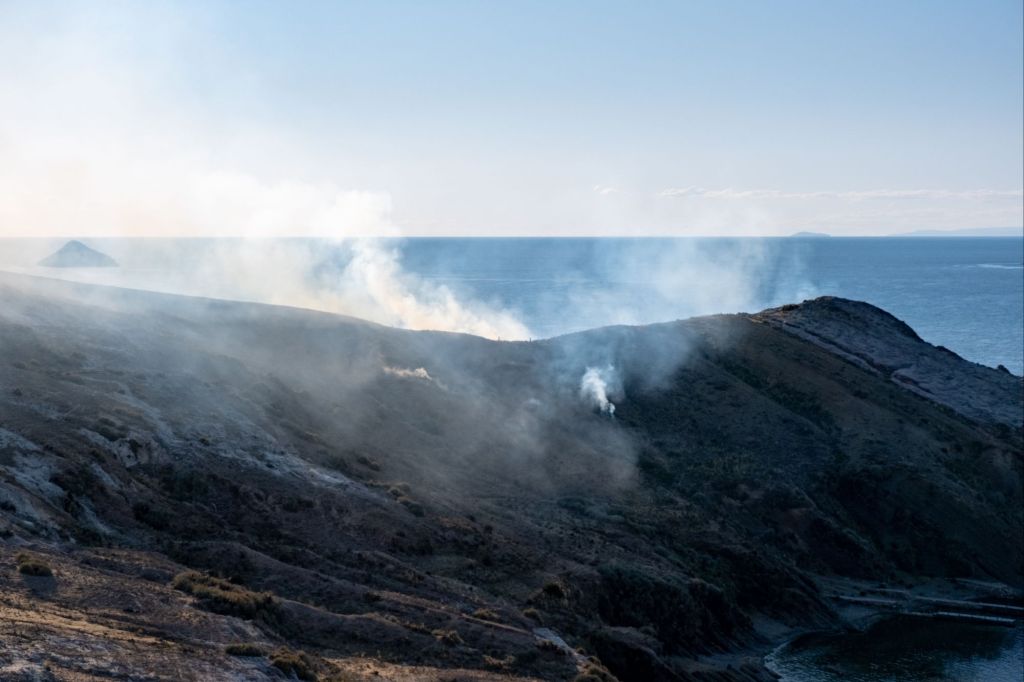 Un peu plus loin, nous croisons quelques ruines, et poursuivons notre chemin jusqu’à la colline la plus au nord, pour admirer le coucher du soleil. Il y a de nombreux feux qui brûlent sur l’île, et un berger qui rentre ses moutons nous explique que c’est à cause de la Saint Jean qui a lieu aujourd’hui.