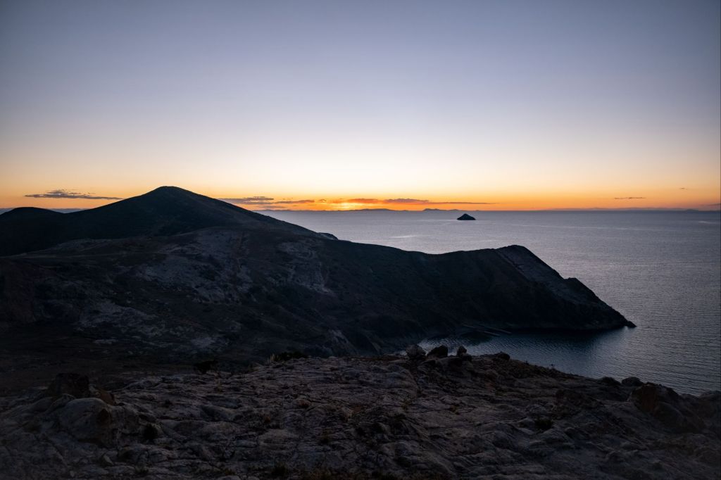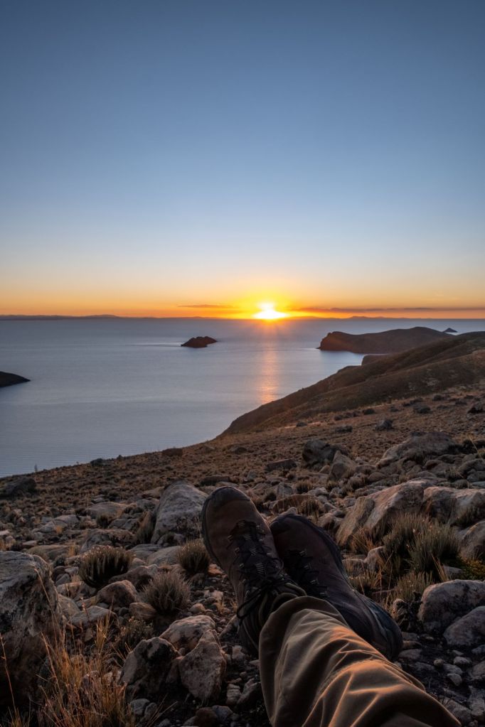 Nous sommes chassés de notre promontoire par la fumée, et finissons par trouver un endroit à l’abri pour admirer le soleil se coucher sur le lac. Les couleurs sont magnifiques !