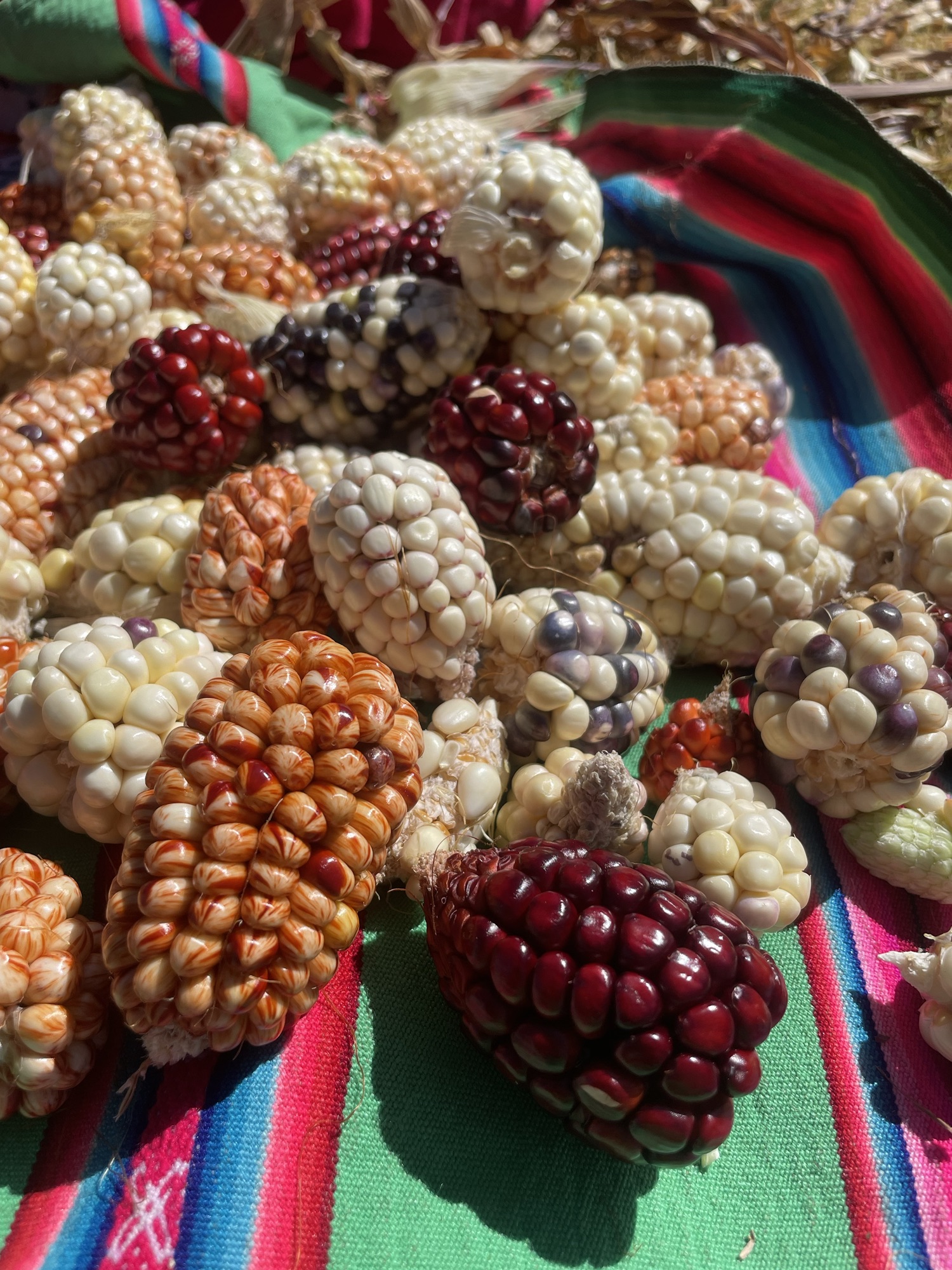 Nous écossons ensuite les pois et épluchons les épis de maïs du jardin. Il y en a de toutes les couleurs : du blanc au rouge, en passant par l’orange.