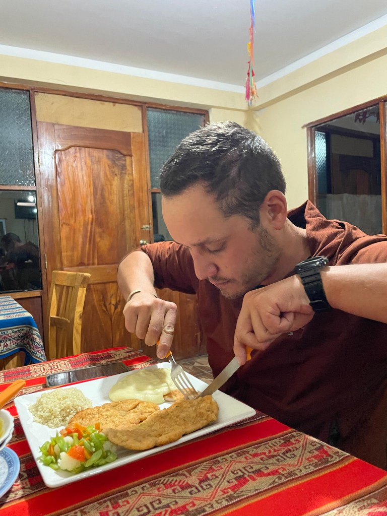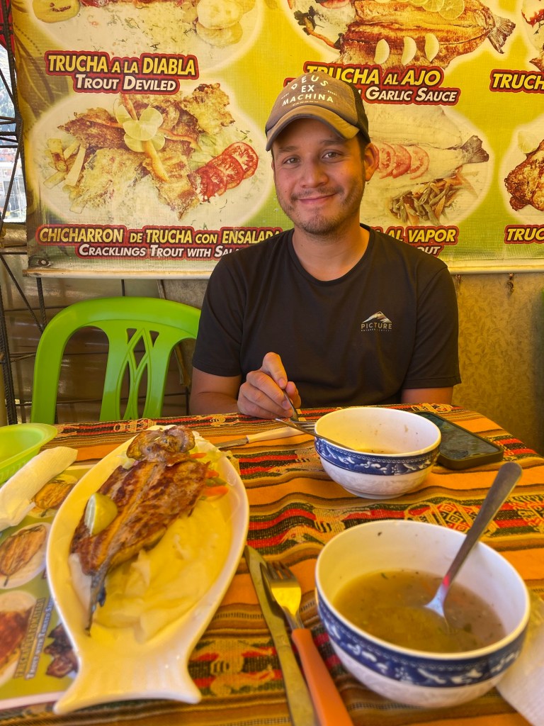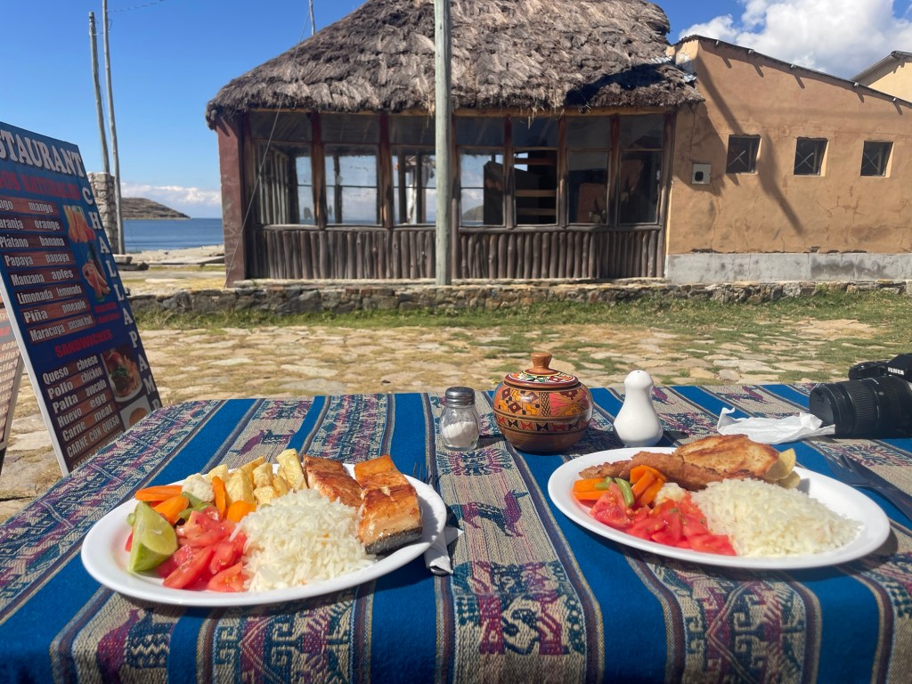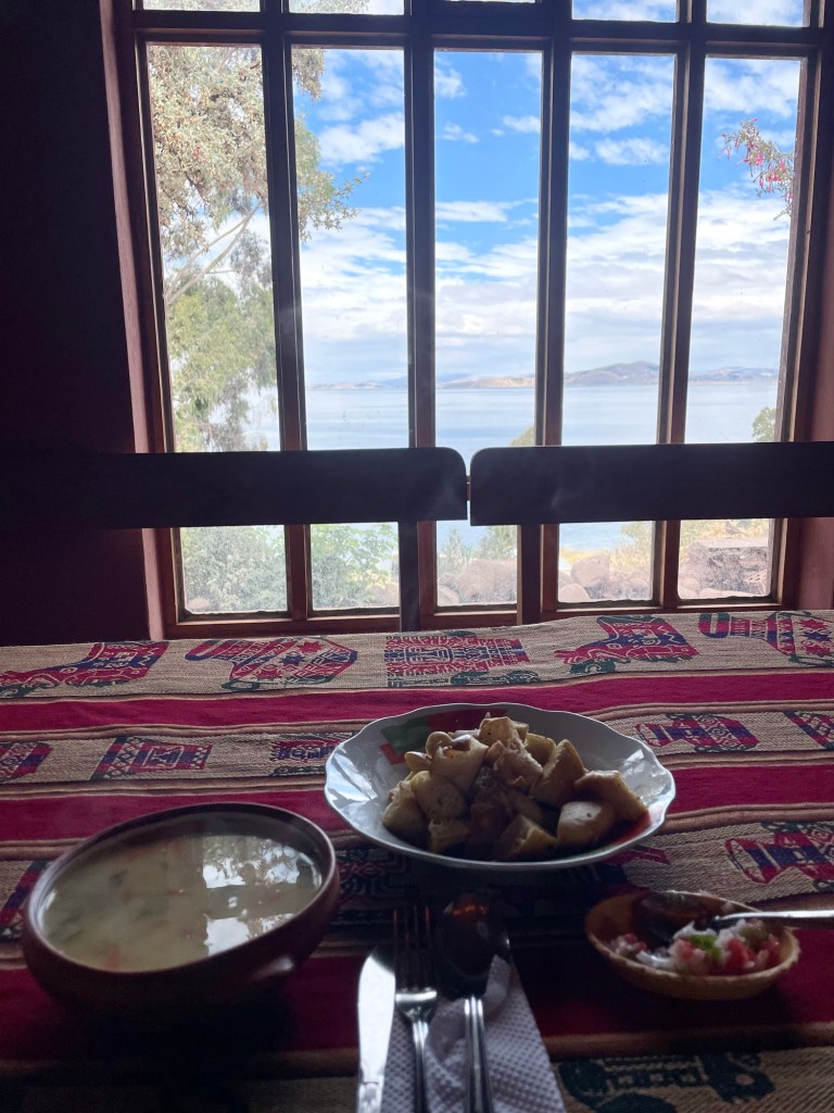 Nous déjeunons dans une grande salle avec vue sur le lac. Au menu : soupe andine (bouillon avec carottes, pommes de terre, herbes et boulgour), accompagnée de pain à l’ail, puis poulet avec du riz et des frites.