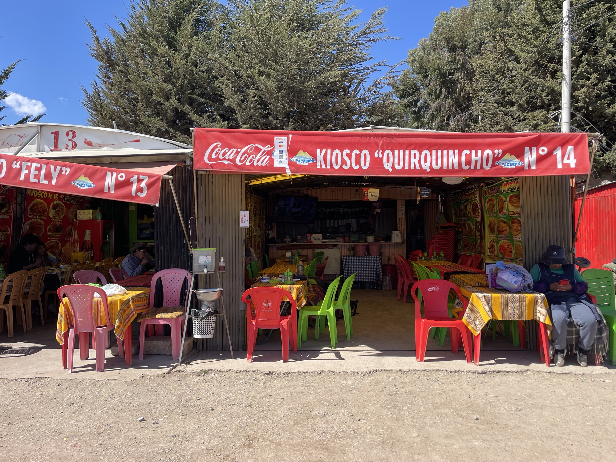 Kiosco « Quirquincho » n°14 (Copacabana) : une vingtaine de petits kiosques qui font les mêmes menus abordables, face au port