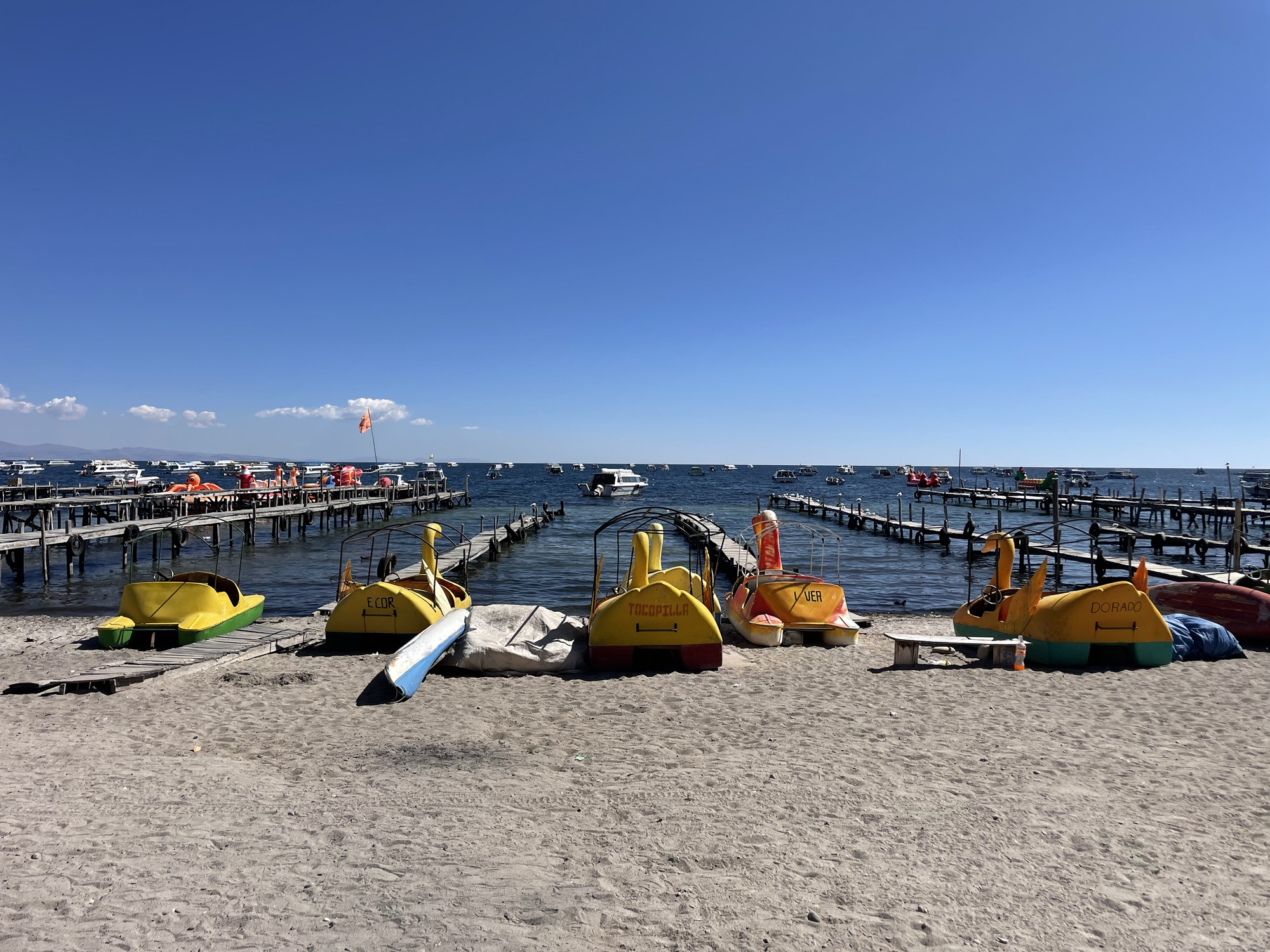 Nous quittons le Pérou aujourd’hui : nous prenons à 7h un bus en direction de Copacabana, de l’autre côté de la frontière bolivienne. Le passage de la frontière est un plaisir : le bus nous dépose côté péruvien, nous faisons tamponner notre sortie du Pérou, nous traversons à pieds et faisons tamponner notre entrée en Bolivie en moins de 10 minutes. Nous en profitons pour échanger nos dernières soles péruviennes contre des bolivianos à un super taux (nous gagnons même de l’argent !), et remontons dans le bus pour la fin du trajet.