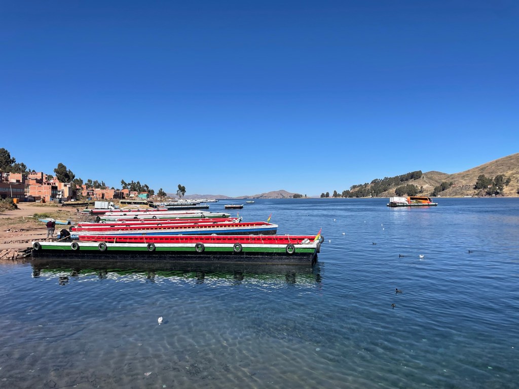 Nous reprenons le bateau pour Copacabana ce matin. Après un petit jus de fruit de la passion sur le port, nous embarquons sur le bateau. La mer est un peu plus agitée aujourd’hui et nous tangons dans tous les sens.