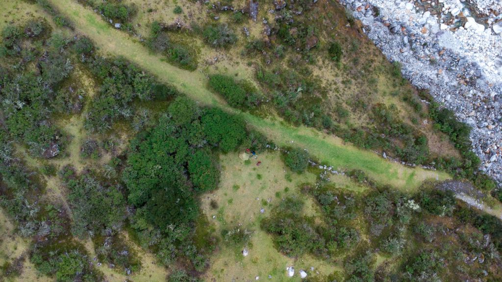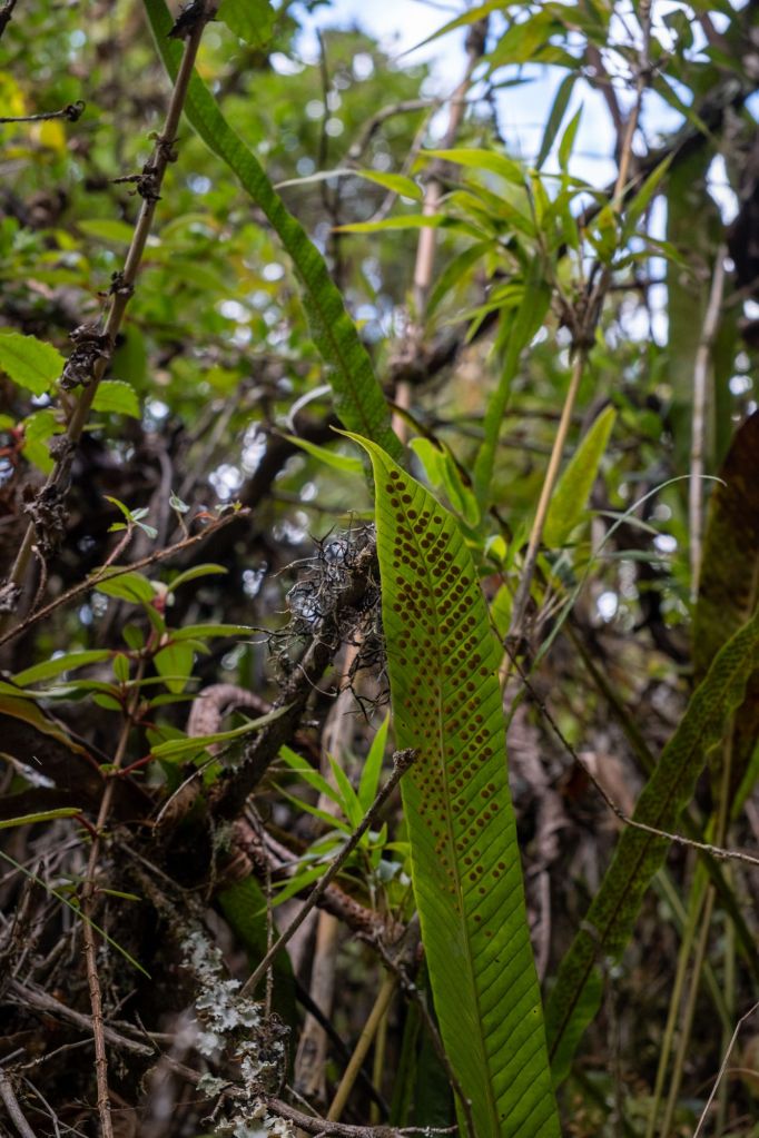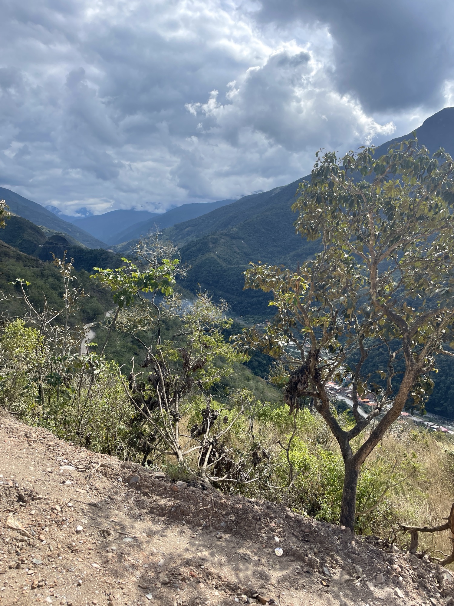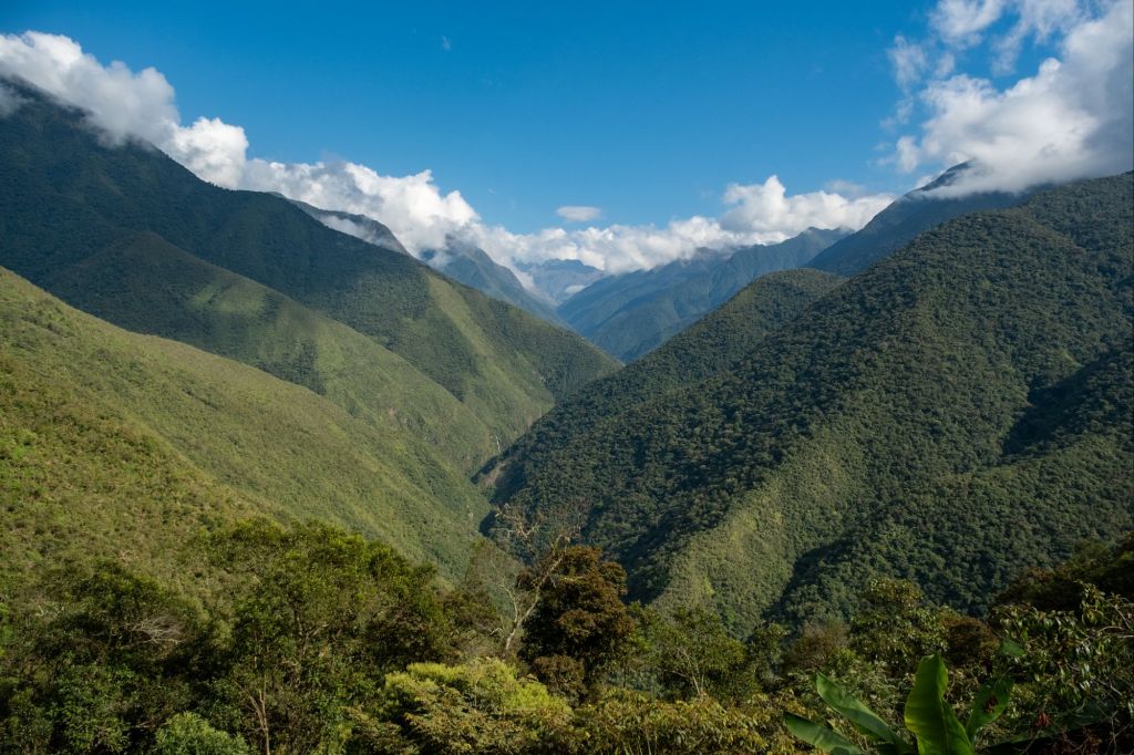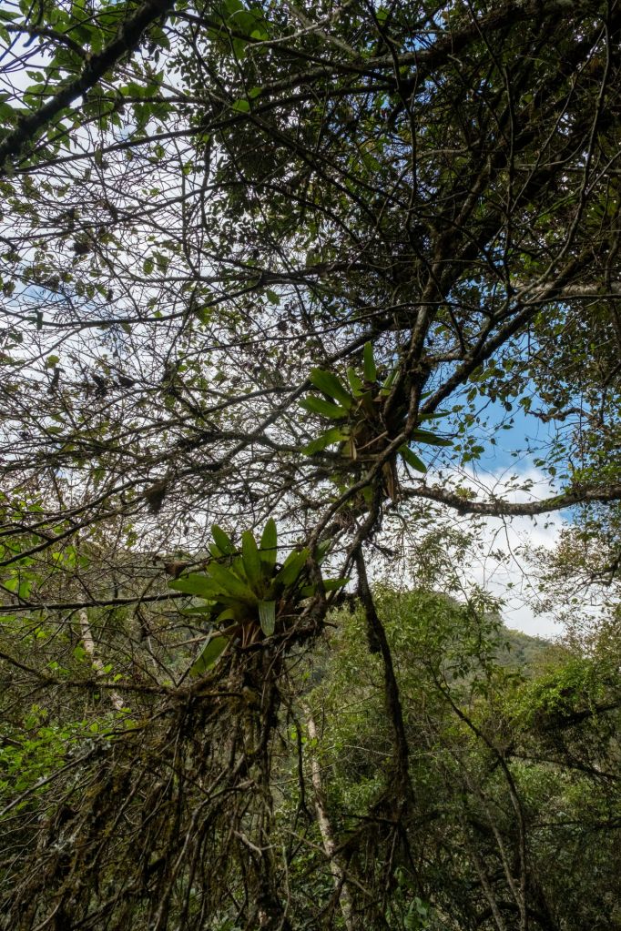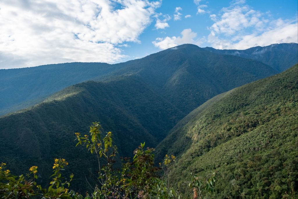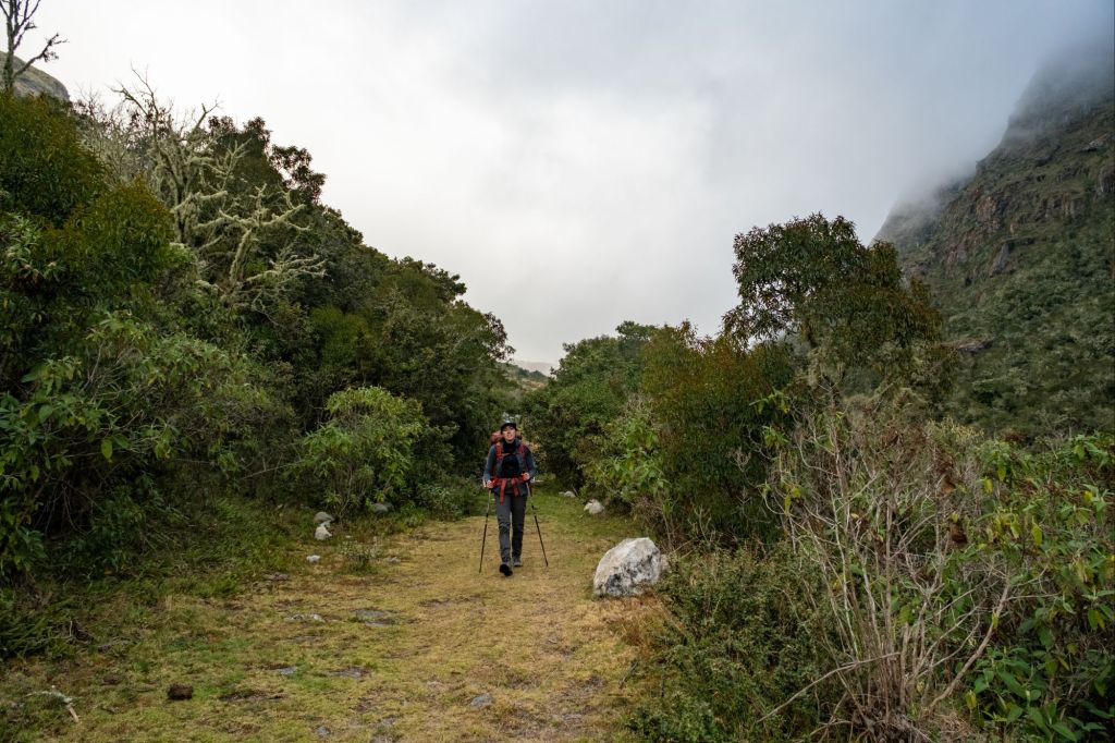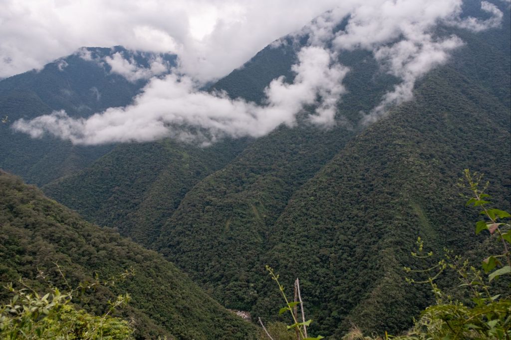 Ce matin ça ne va pas fort : Guillaume est malade, ses intestins lui font payer sa journée de street food à El Alto… Nous partons sans grande motivation après avoir mangé un petit porridge au chocolat et avoir replié la tente. Il fait bien plus humide à cette altitude, et un gros nuage est posé juste au-dessus de nous, cachant un peu la vue. Les petits arbustes sont remplacés par une forêt de plus en plus dense et tropicale : fougères et même bananiers apparaissent.