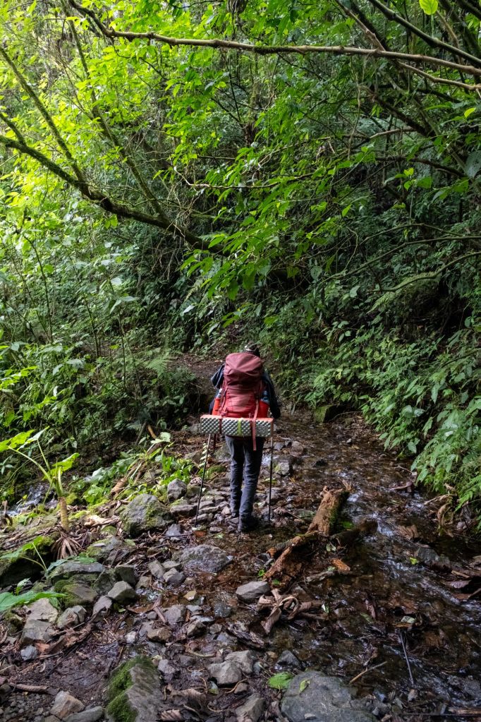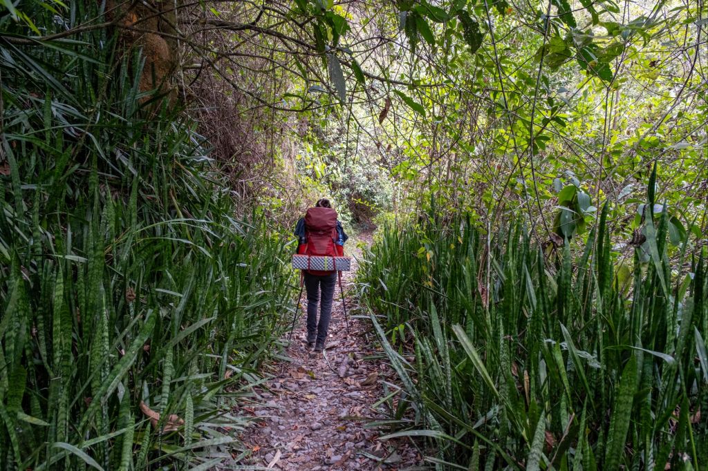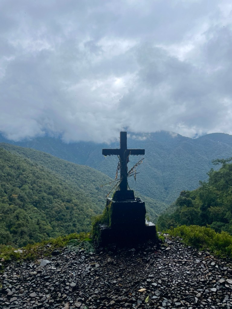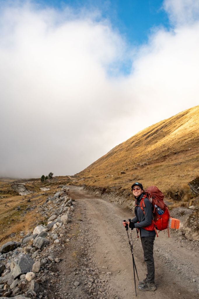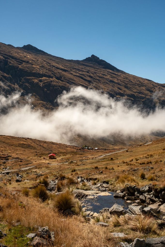 La nuit fut un peu écourtée pour ma part : j’ai été réveillée par une bête qui fouillait dans les poubelles abandonnées dehors, et j’ai eu du mal à me rendormir. Quand nous nous réveillons, le soleil est caché par un gros nuage qui semble posé dans la vallée. Guillaume va mieux et le moral est un peu meilleur, nous nous sentons en forme pour arriver tôt à la fin du sentier ! Quand la vue se dégage, nous apercevons les montagnes alentour, verdoyantes jusqu’à leur sommet, et ponctuées de quelques cascades. Cela nous rappelle La Réunion !