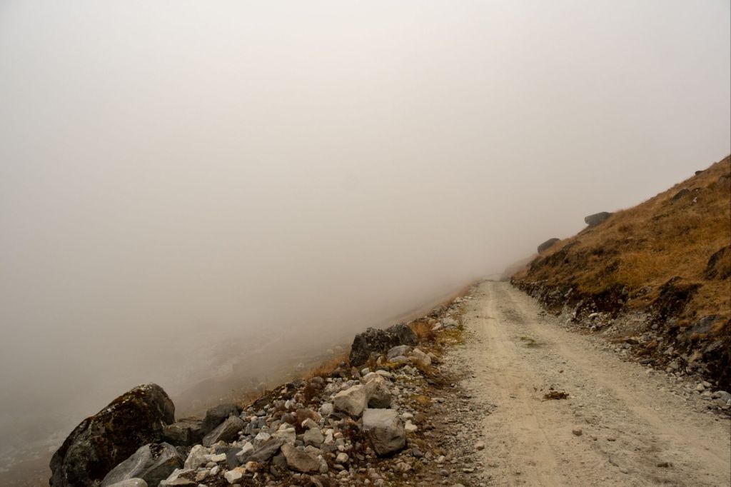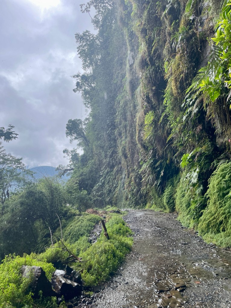 Arrivés au col, la descente se poursuit sur une petite piste de gravier, à pic, ponctuées de quelques voitures moisissant dans le fossé. La végétation est dense et humide, et la plupart de la route se fait dans un nuage, ce qui ajoute une touche mystique. Il y a même quelques cascades sur le chemin.