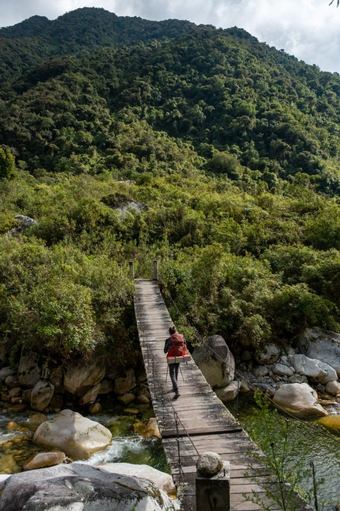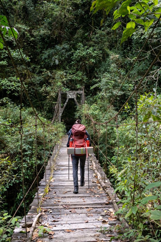 Nous poursuivons le chemin de plus en plus difficilement. Guillaume est toujours bien malade, nous faisons des pauses très souvent et (pour une fois) je récupère une partie du contenu de son sac. Les kilomètres passent de plus en plus lentement, j’ai mal aux pieds, aux genoux et au dos. Nous traversons des petits ponts de singe, faits de quelques morceaux de bois attachés ensemble par des fils métalliques.