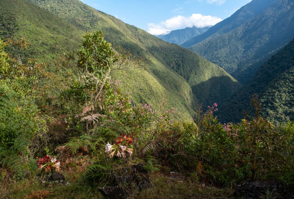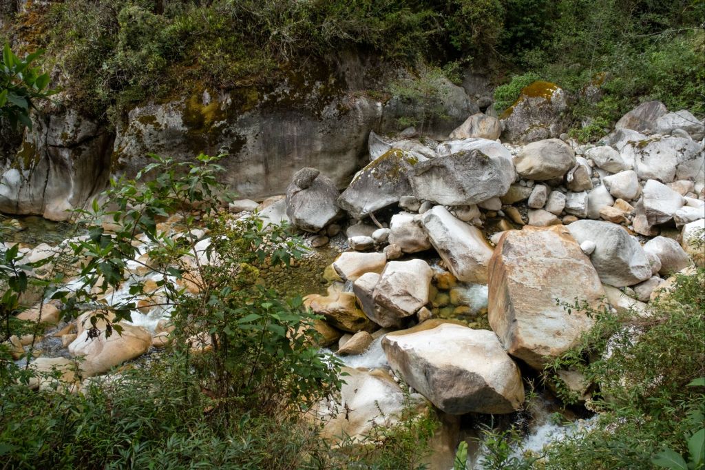 Plus nous descendons et plus il fait chaud et humide, nous voici arrivés dans la jungle. Nous traversons la rivière plusieurs fois et croisons des petits cascades. Des fleurs commencent à apparaître sur les bords du chemin.