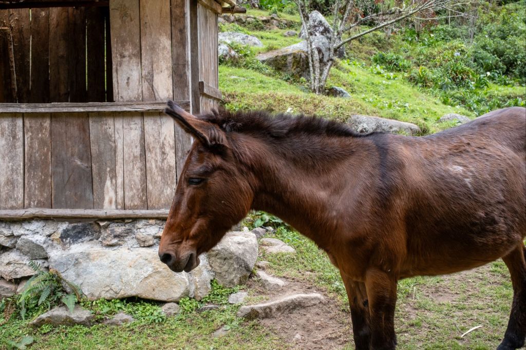 Nous déjeunons dans un des petits refuges du circuit, sur une petite table avec vue sur le jardin fleuri. Nous mangeons des pâtes à la sauce tomate et aux petits légumes (achetés directement coupés sur le marché, très pratique pour le trek). Les petits ânes du refuge viennent nous tenir compagnie pendant notre repas.