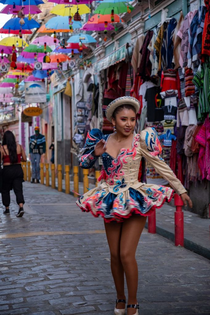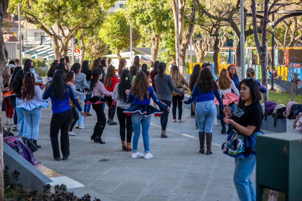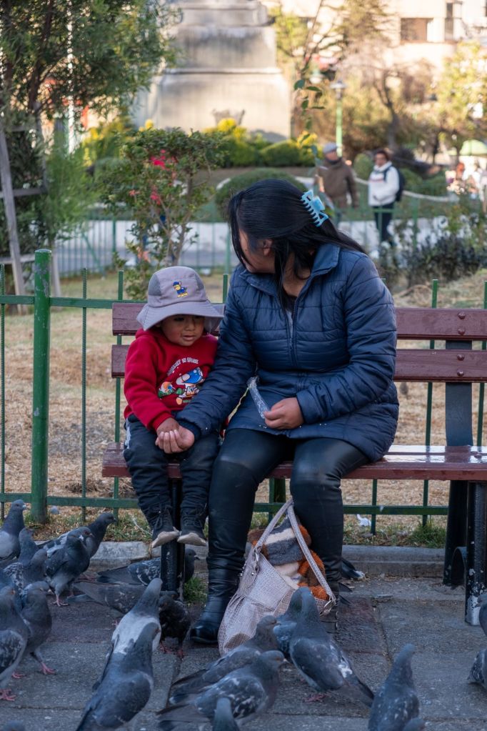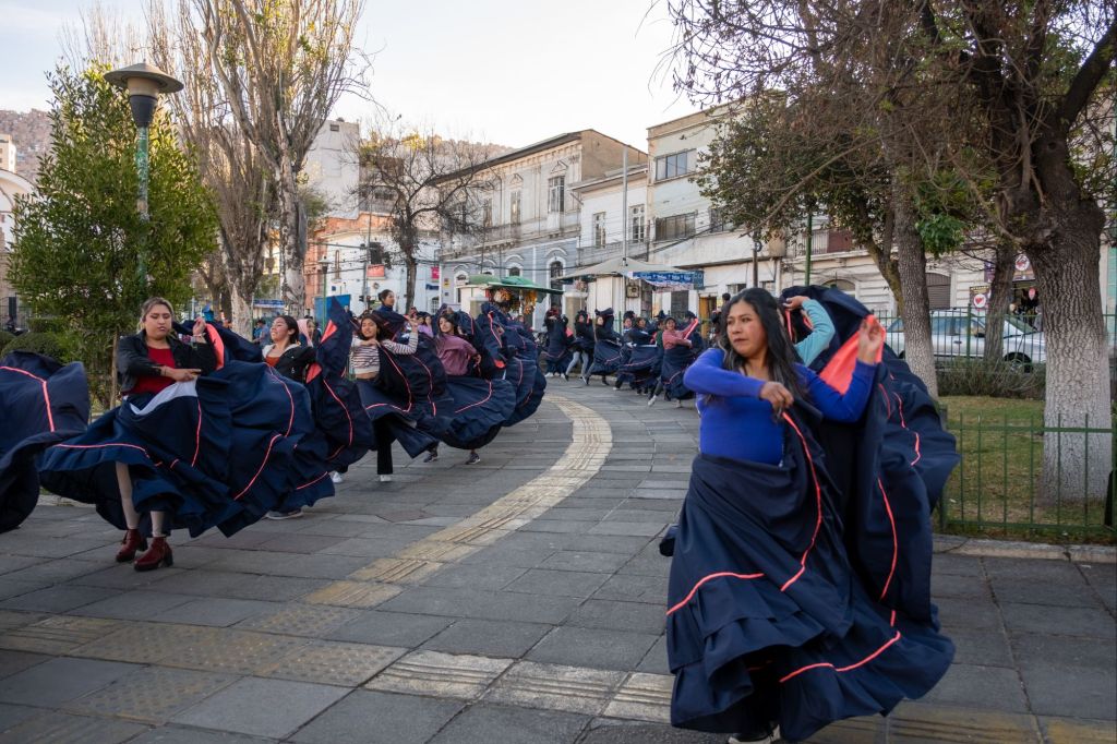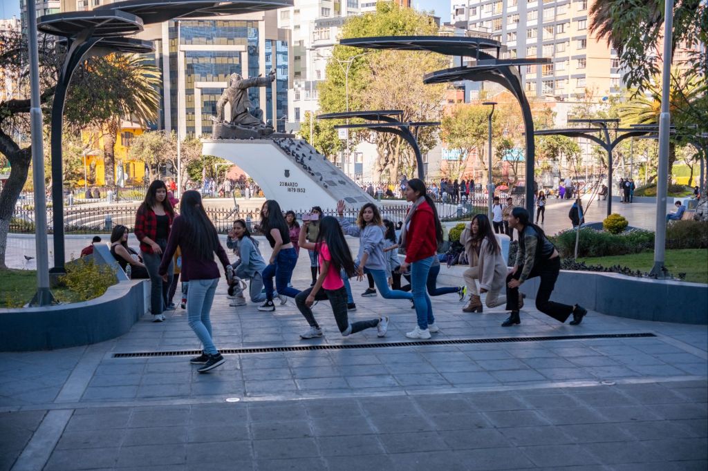 Nous terminons notre promenade sur la Plaza Avaroa, une grande place ombragée où les boliviens se retrouvent pour danser. Il y a plusieurs groupes d’hommes et de femmes qui répètent leurs chorégraphies au son de grosses baffles amenées pour l’occasion.
