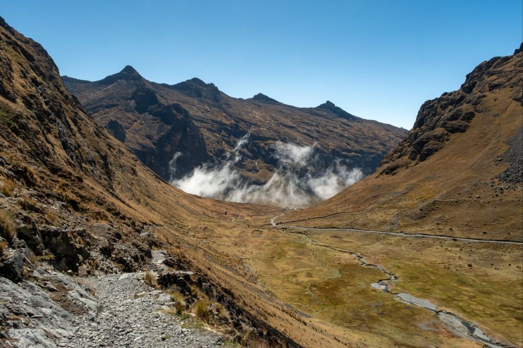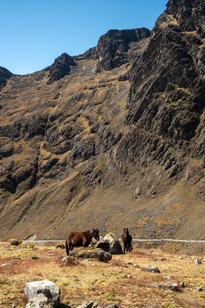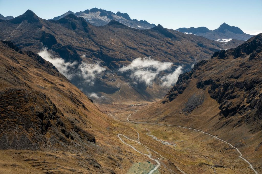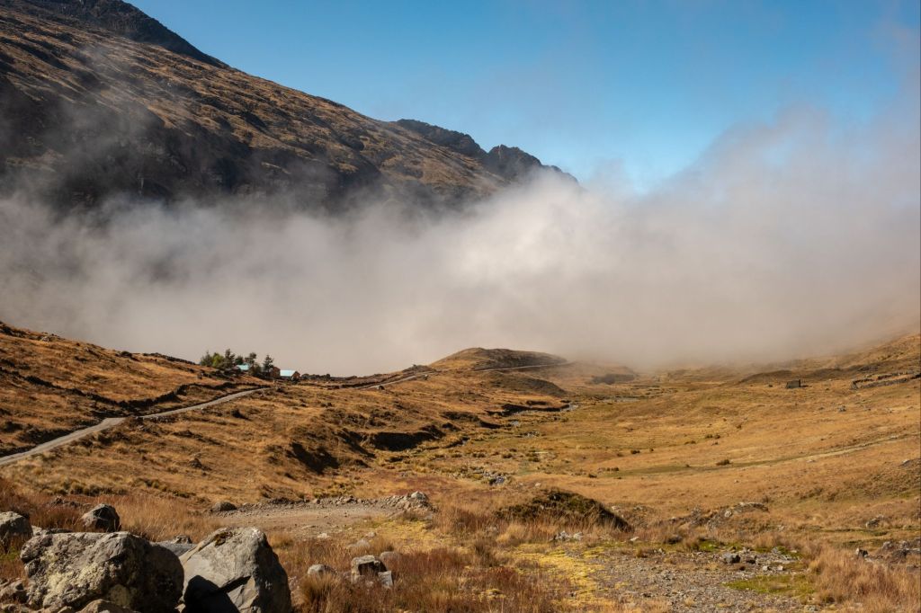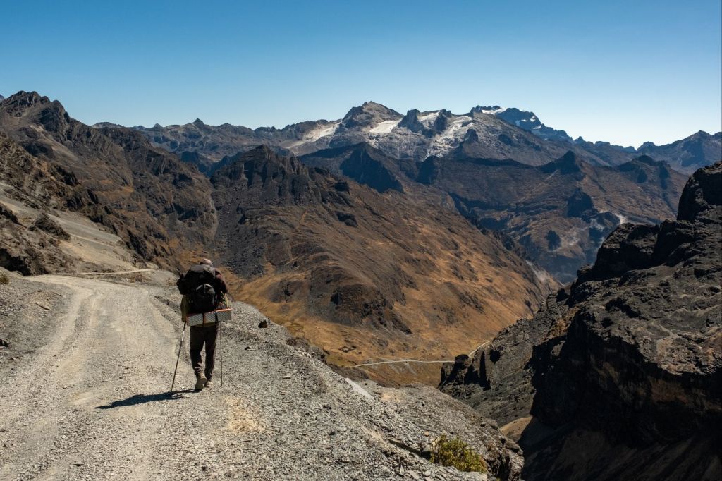 Ce matin, nous prenons un collectivo direction Coroico, pour nous rendre du départ du trek El Choro. Le bus nous arrête à La Cumbre, lieu-dit où débute le sentier. Nous commençons à marcher à 4650m et grimpons jusqu’au col situé à 4850m. Il ne fait pas chaud et il y a un vent à décorner les bœufs, nous avons même du mal à marcher !