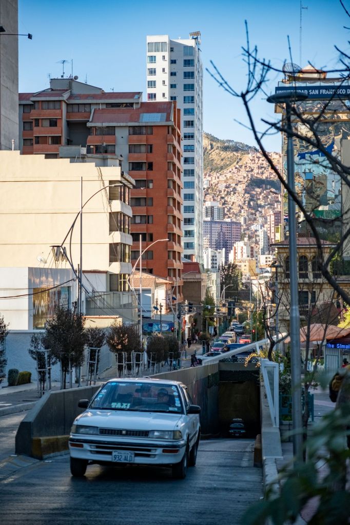 Notre collectivo nous conduit à bonne vitesse sur une petite route sinueuse avec une visibilité quasi nulle (nous sommes encore dans le fameux nuage) et de nombreux travaux qui amputent une voie sur les deux disponibles. Nous finissons par sortir du nuage au niveau du col, et arrivons sains et saufs à La Paz.