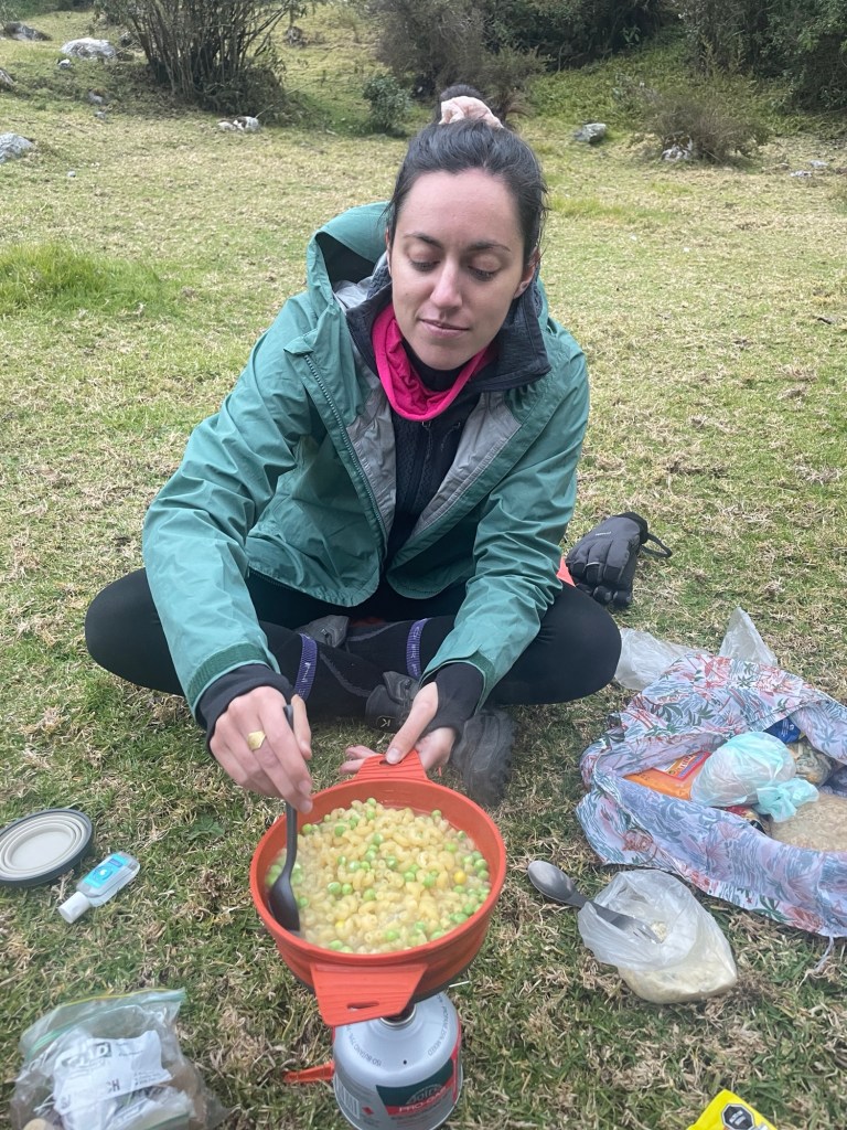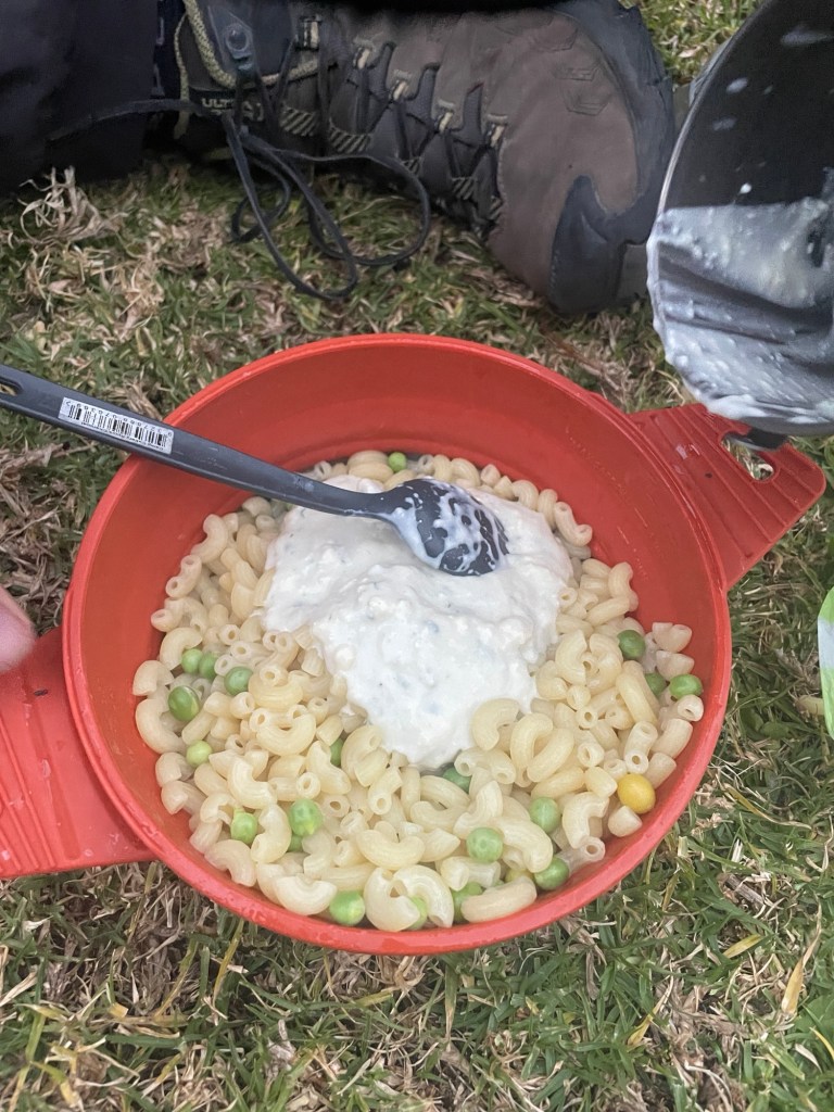 En fin d’après-midi, nous trouvons un petit terrain bien plat avec un moelleux tapis d’herbe verte, sur lequel nous plantons notre tente. Au menu de ce soir : pâtes aux petits pois et au bleu, c’était très bon et réconfortant.