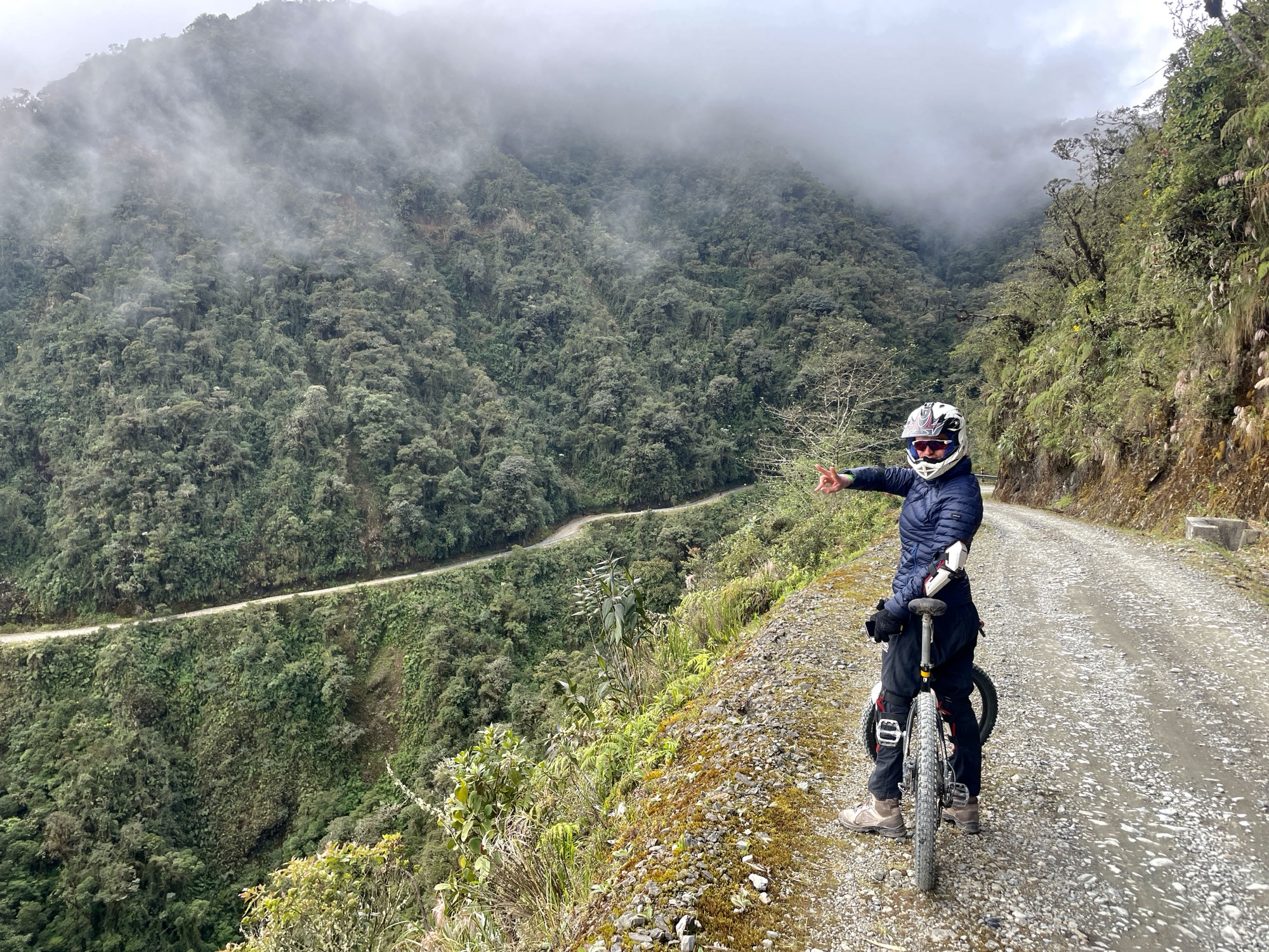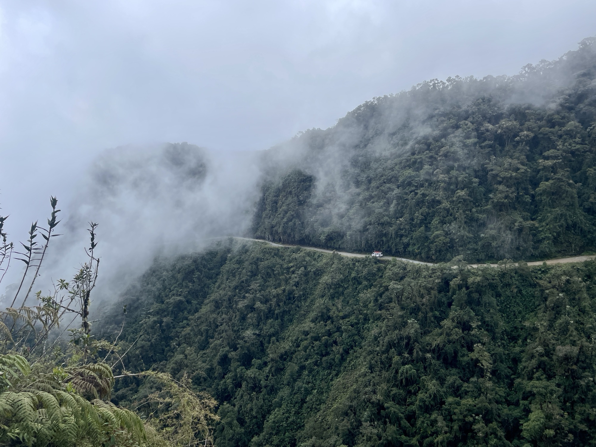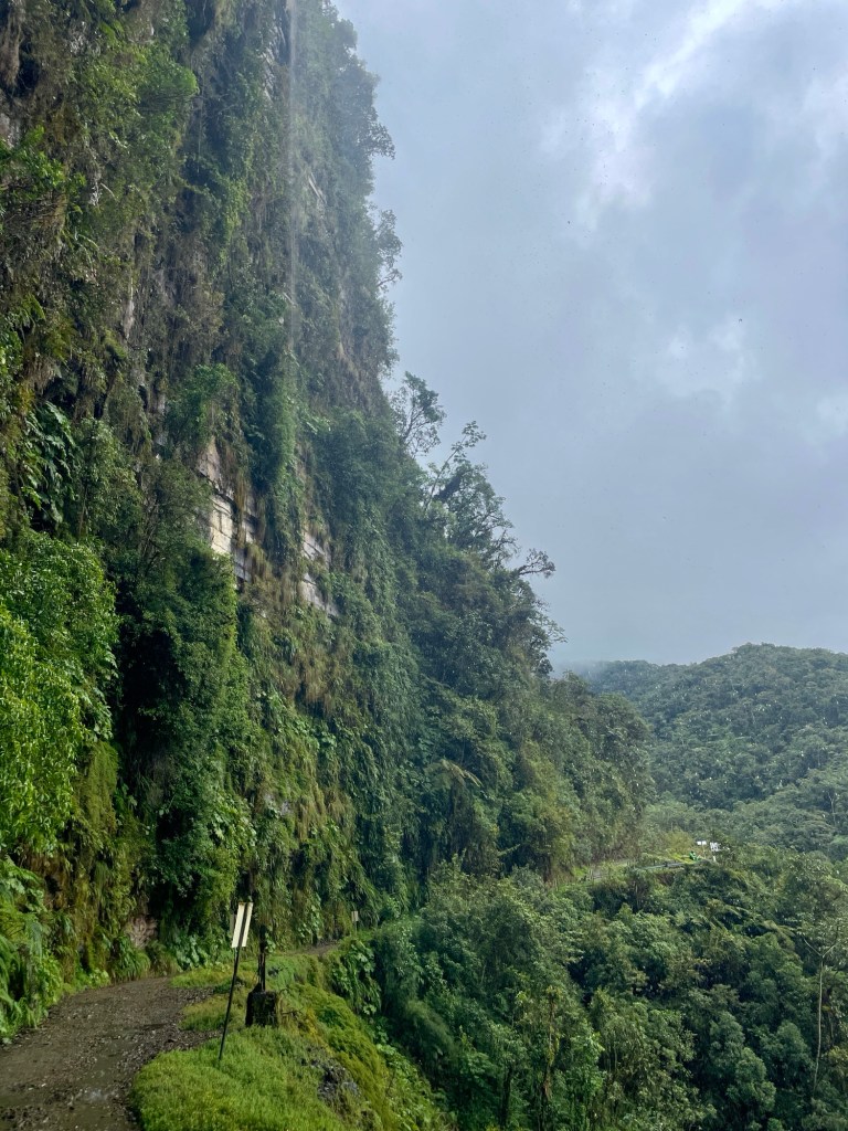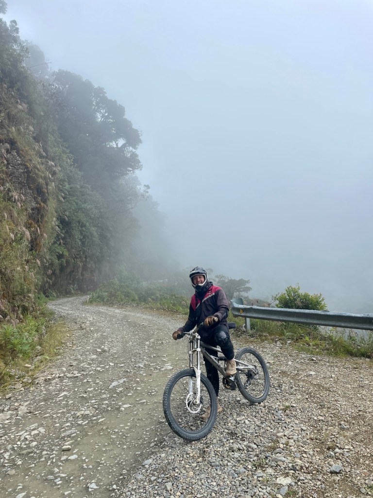 Aujourd’hui, Guillaume part en excursion sur la route de la mort (El camino de la muerte), pendant que je reste au lit. Cette route porte ce nom car, à l’époque où elle était quotidiennement utilisée, ses nombreux virages et sa falaise escarpée ont malheureusement engendré de nombreux accidents. Maintenant elle est devenue très populaire chez les touristes, pour profiter de ses magnifiques vues en descendant en VTT. Le départ se fait depuis La Cumbre (là où nous avions commencé notre trek), la première partie se fait sur la route, avec des voitures doublant à pleine vitesse.