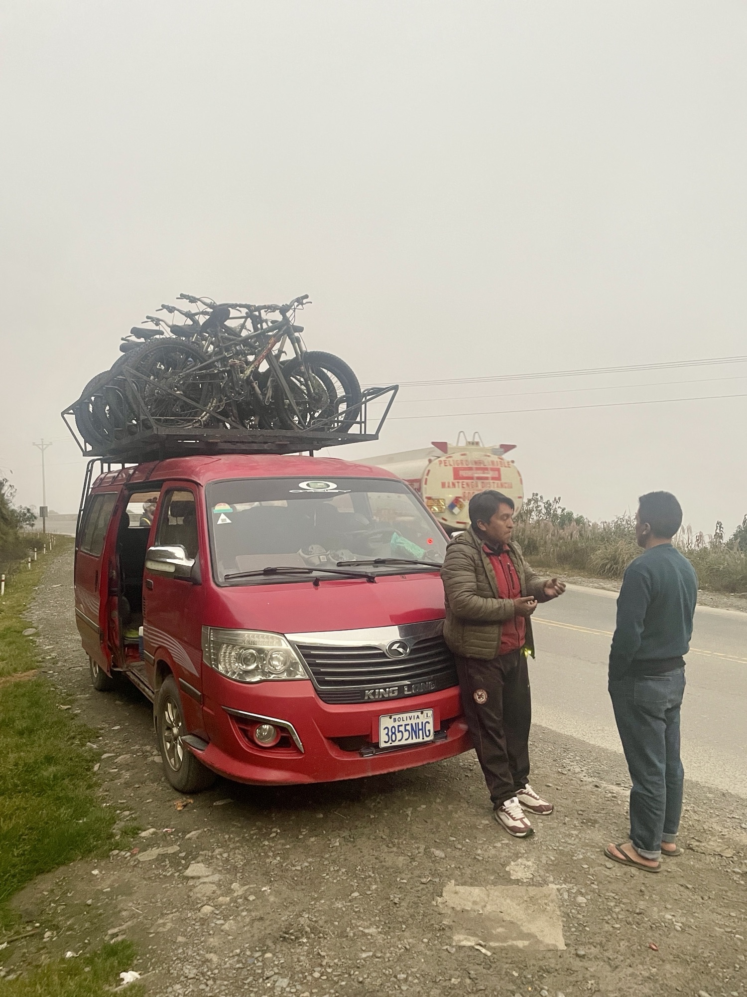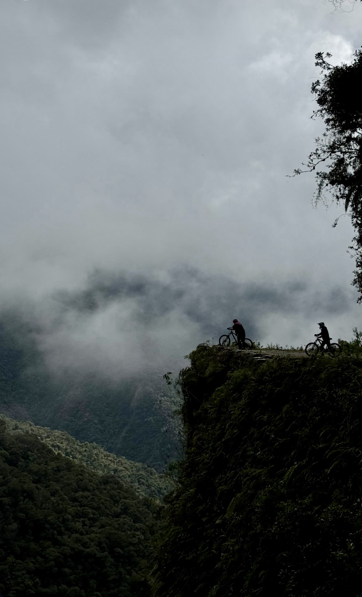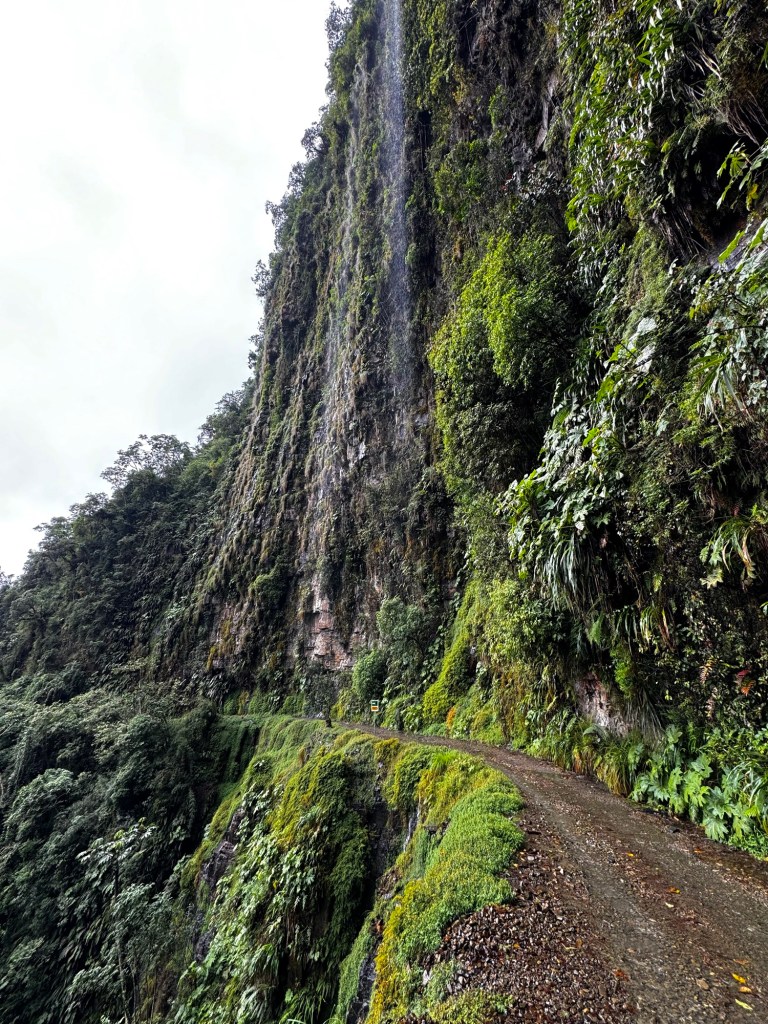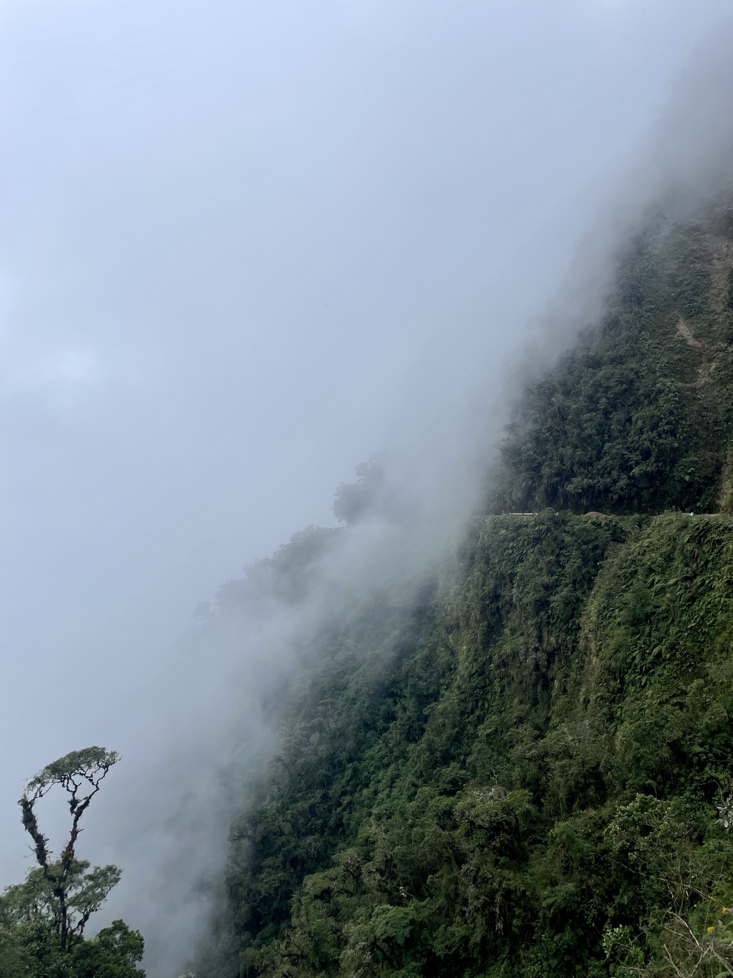 Aujourd’hui, Guillaume part en excursion sur la route de la mort (El camino de la muerte), pendant que je reste au lit. Cette route porte ce nom car, à l’époque où elle était quotidiennement utilisée, ses nombreux virages et sa falaise escarpée ont malheureusement engendré de nombreux accidents. Maintenant elle est devenue très populaire chez les touristes, pour profiter de ses magnifiques vues en descendant en VTT. Le départ se fait depuis La Cumbre (là où nous avions commencé notre trek), la première partie se fait sur la route, avec des voitures doublant à pleine vitesse.