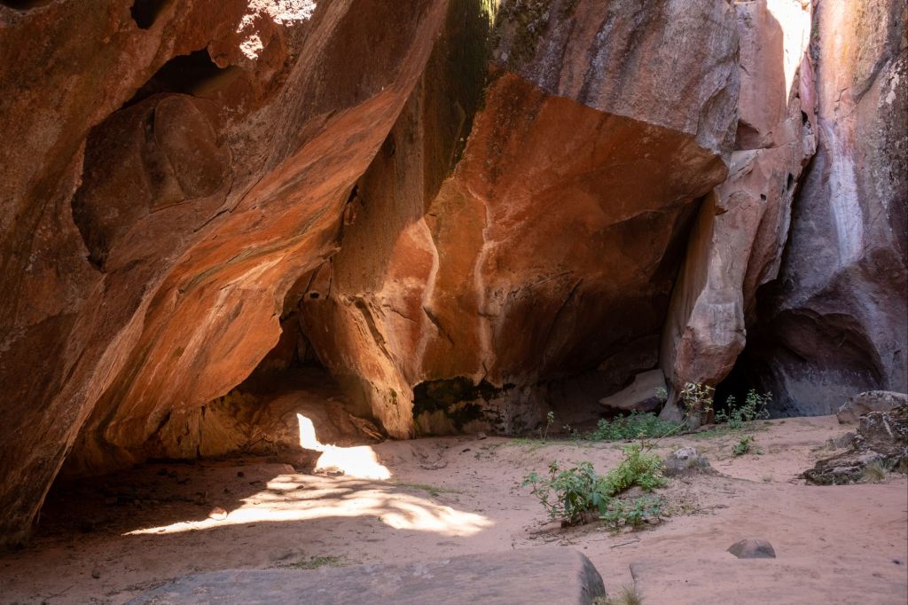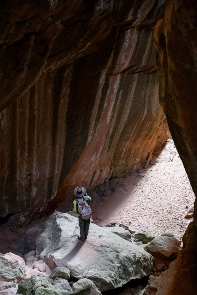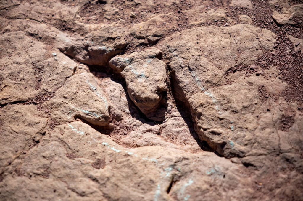 Après le pique-nique, nous partons explorer une grotte en spéléologie. Nous coiffons nos casques et nos lampes frontales, et Martin emmène une petite corde pour la forme. Sur le chemin, nous croisons des traces de dinosaures, qui font la renommée de ce parc dans toute la Bolivie. Nous n’aurons malheureusement pas plus d’explications.