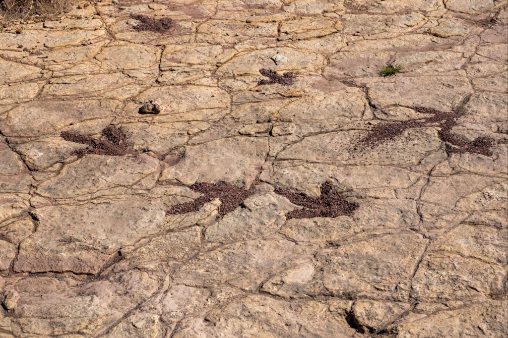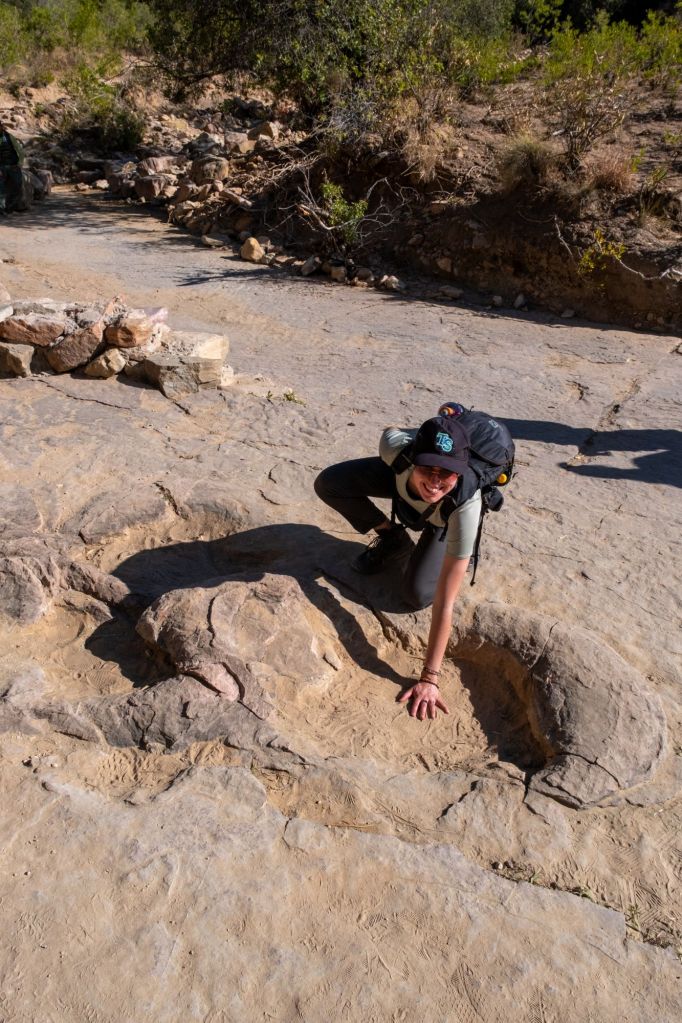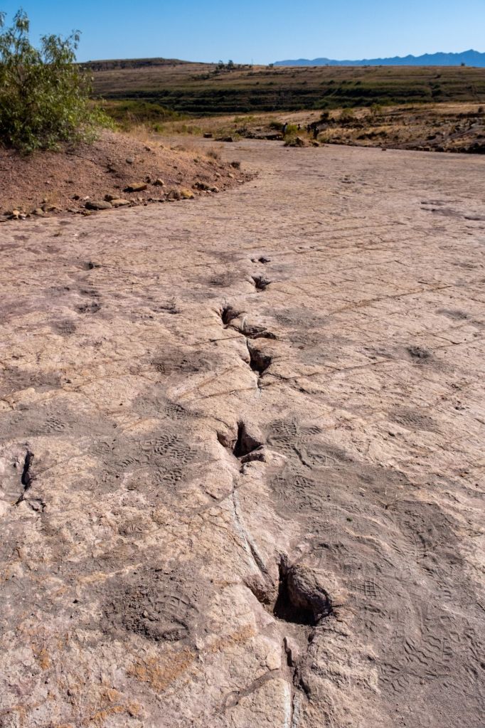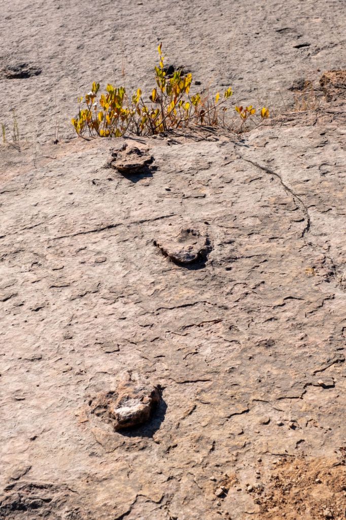 Pour ce 2ème jour, nous sommes tous les 4 avec Romane et Quentin, et nous demandons explicitement un autre guide (ils essayent encore de nous refiler Martin). Nous partons d’abord admirer les traces de dinosaures dont le parc est truffé. Elles datent de la période du Crétacé (-145 à -65 millions d’années), peu avant l’extinction des dinosaures. Le parc était un endroit de passage lors de leurs migrations, et son sol boueux a permis de conserver les empreintes en les fossilisant.