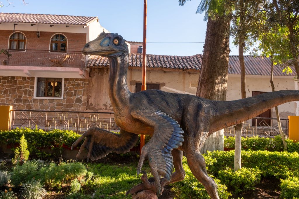 Nous rentrons en fin d’après-midi, et en profitons pour immortaliser la place principale du village, dans le thème dinosaure jusqu’au bout : statue géante, bancs à l’effigie des dinosaures…
