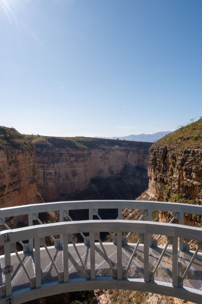 Dès que le soleil commence à baisser, nous remontons l’abrupte falaise du canyon par un petit chemin qu’il faut presque escalader. Nous arrivons à un impressionnant mirador avec un petit pont en métal au-dessus du vide, qui donne une merveilleuse vue sur tout le canyon. Nous avons même la chance d’apercevoir un condor au milieu du ballet des vautours.