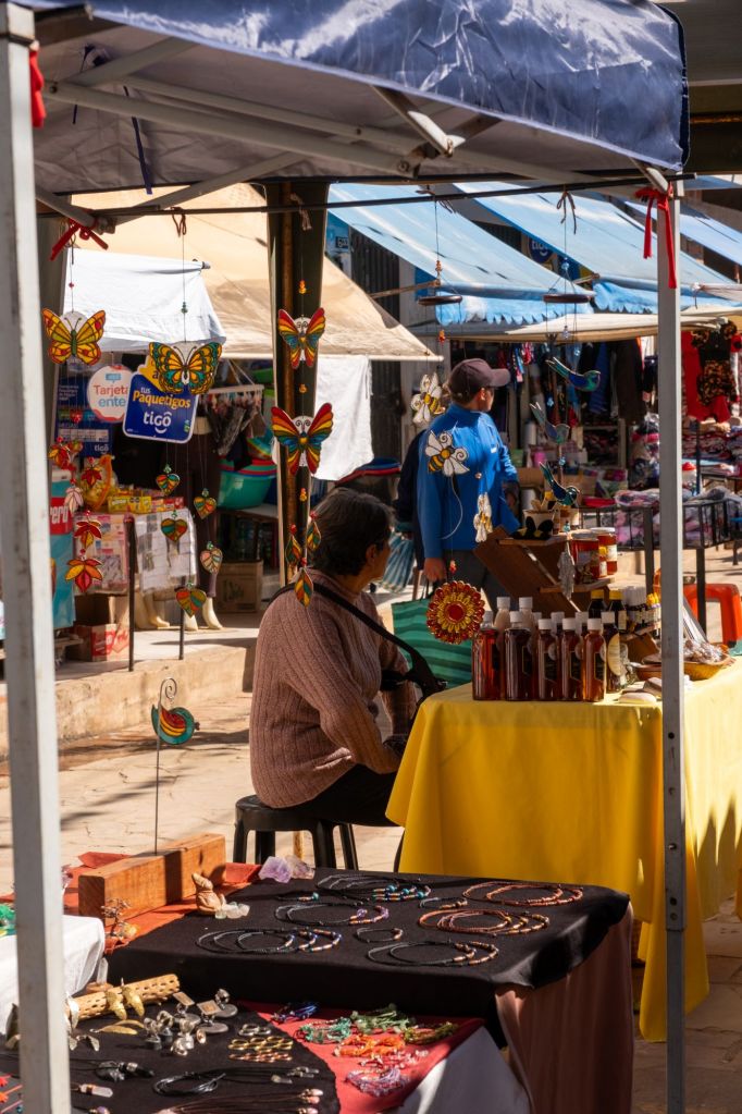 Aujourd’hui c’est l’anniversaire de Guillaume ! Nous ferons un bon restaurant à Sucre pour fêter ça, car le choix n’est pas énorme ici. Nous commençons par aller prendre le petit déjeuner dans un café hors de prix sur la jolie place principale, puis nous allons nous promener dans le centre. Comme c’est dimanche, il y a un petit marché dans une rue piétonne de la ville. Les stands alternent entre boliviens qui vendent des chinoiseries en plastiques, ou hippies étrangers qui vendent des bracelets en tissu ou des huiles essentielles. La ville est très cosmopolite et de nombreux baba cools sont venus y habiter pour profiter du climat clément et vendre leurs créations artistiques ou des cours de yoga. Nous passons également au marché pour acheter de quoi faire nos piques-niques pour les prochains repas.