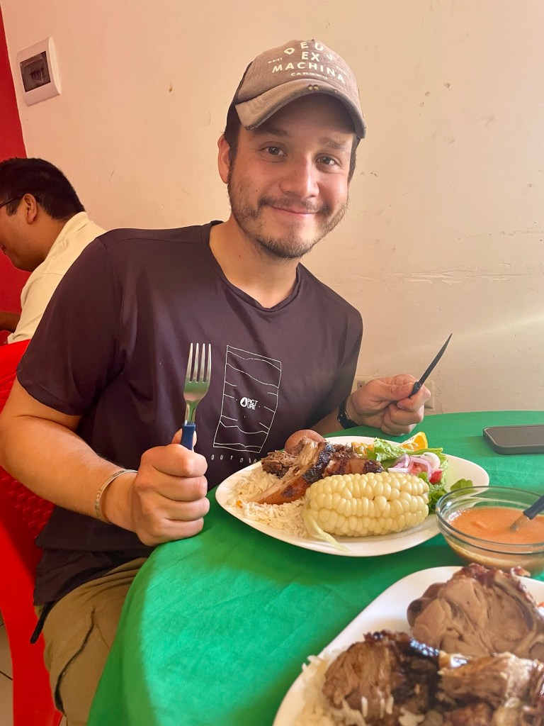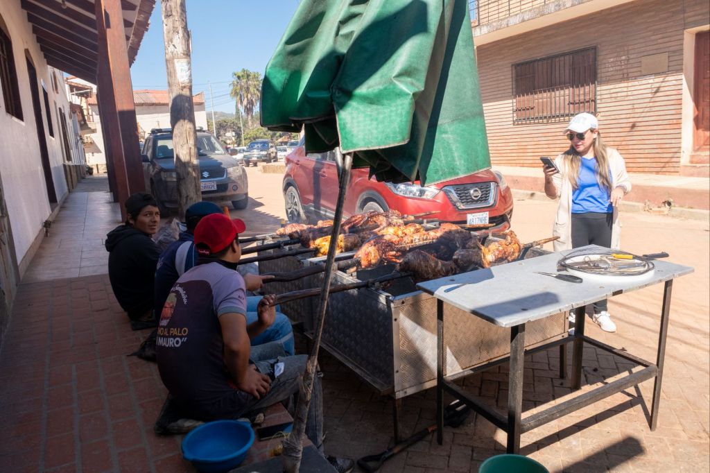 Pour notre déjeuner, Guillaume a repéré du cochon à la broche qui rôtit dans la rue. C’est le rendez-vous de toute la ville, tous les boliviens vont dans ce minuscule petit restaurant, et nous arrivons tant bien que mal à nous faire servir les derniers morceaux !