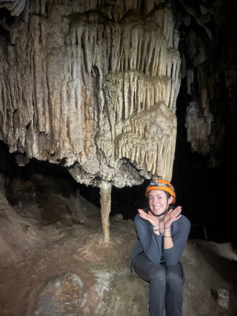 Nous devons ramper plusieurs fois, et quelques passages nécessitent une petite corde pour ne pas glisser. Au fond de la grotte, une rivière souterraine passe, dans laquelle nous apercevons des petits poissons chats et quelques têtards.