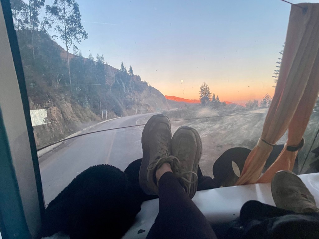 Nous embarquons à l’heure prévue et partons pour 9h de trajet. Nous sommes bien installés, à l’étage avec vue panoramique. Le paysage défile. Entre podcasts et films, nous quittons la ville et roulons à pleine vitesse sur la route principale traversant les petits villages, en direction de l’Est.