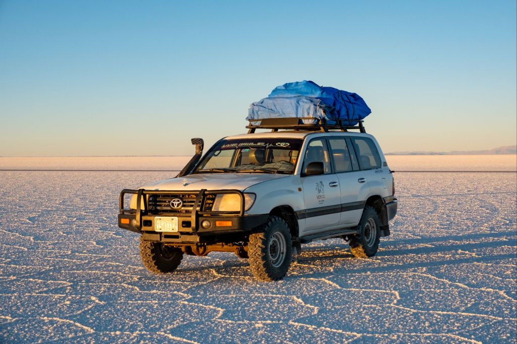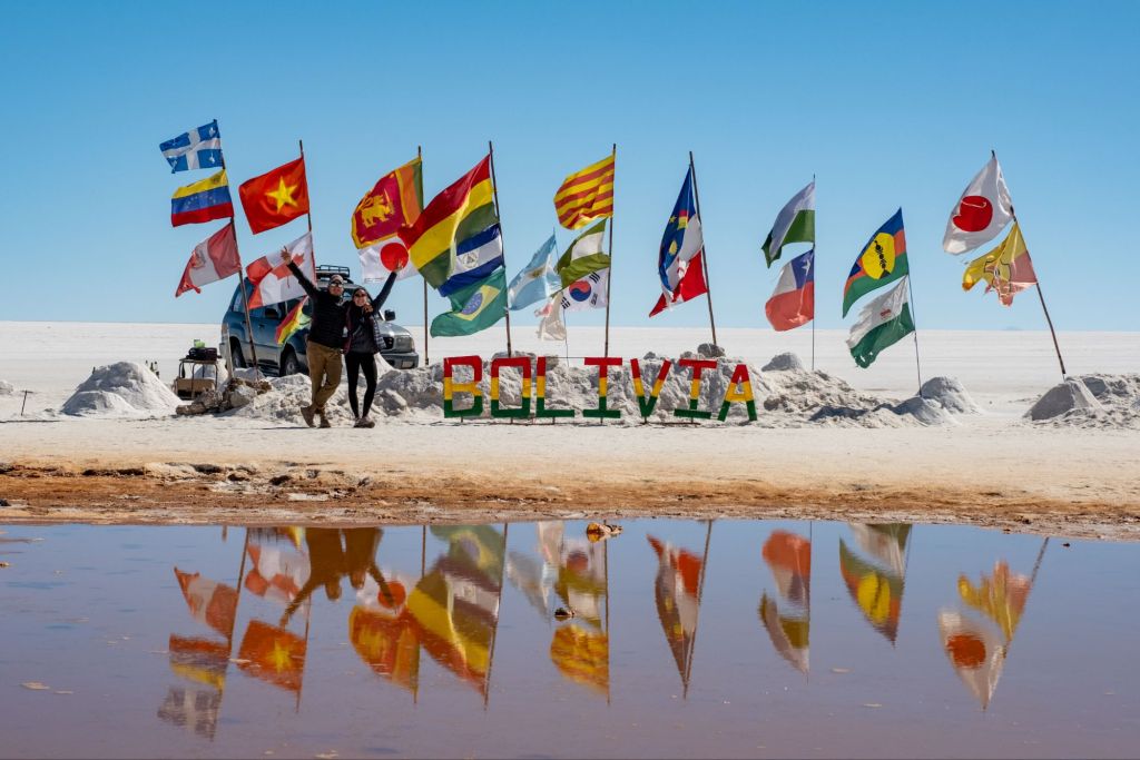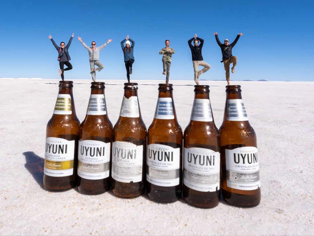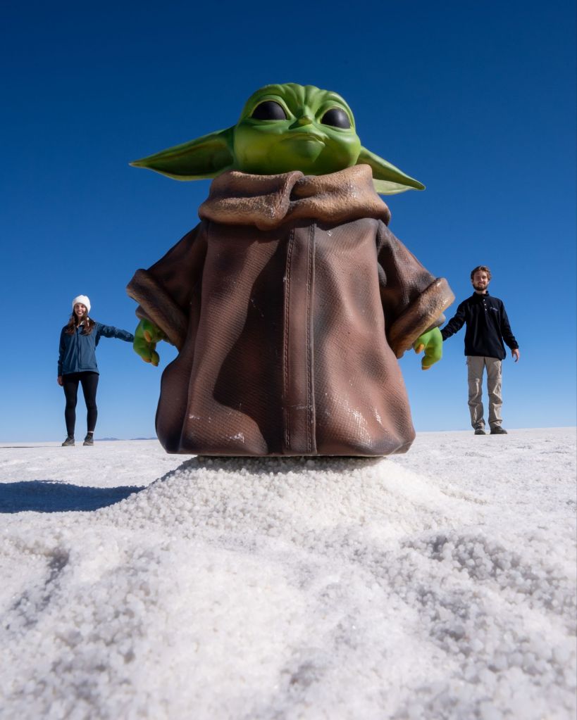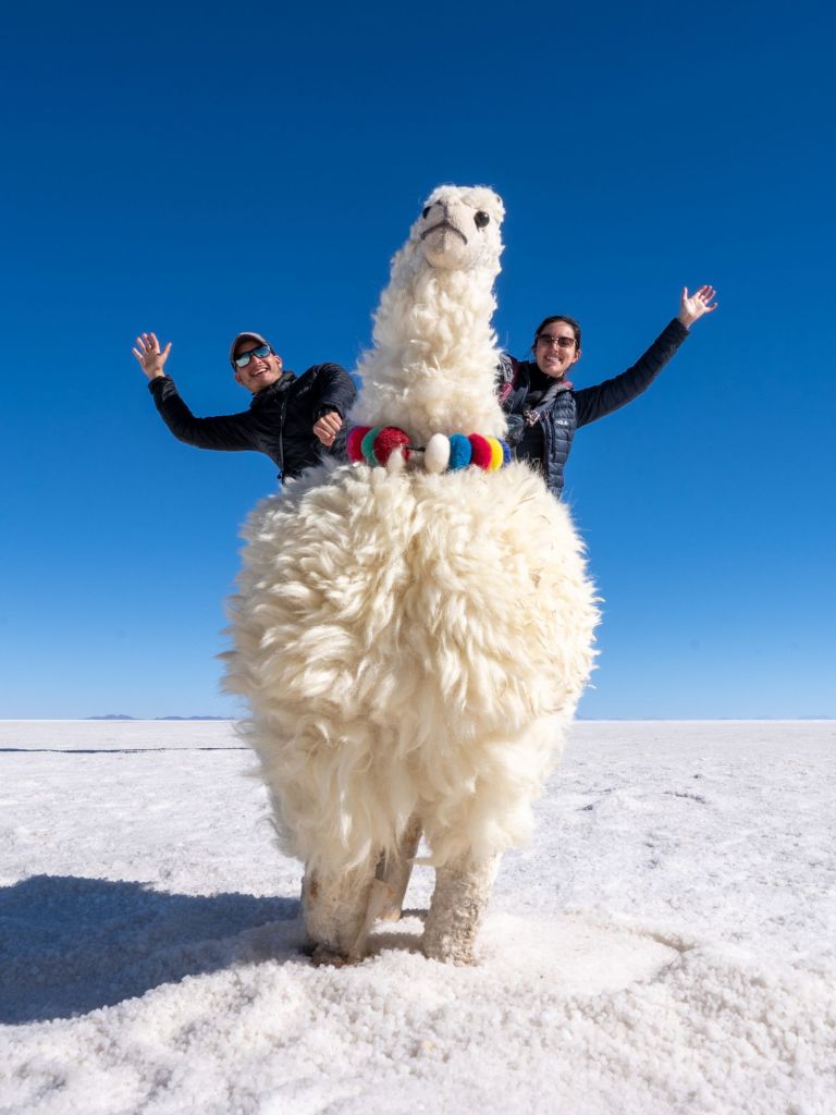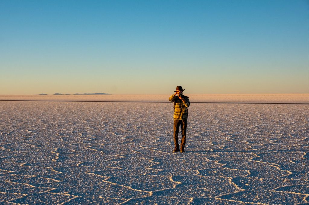 Après le déjeuner dans une maison fabriquée en briques de sel, puis nous rendons dans le fameux Salar d’Uyuni. C’est le plus grand désert de sel au monde, avec une superficie de plus de 10 000 km carrés. Il s’est formé à la suite de l’évaporation d’un lac préhistorique il y a 14 000 ans. À l’entrée dans le Salar, un local a monté sa petite entreprise : il fait des photos pour les touristes en jouant sur les perspectives. Il a plein d’accessoires, et nous nous prêtons volontiers au jeu !